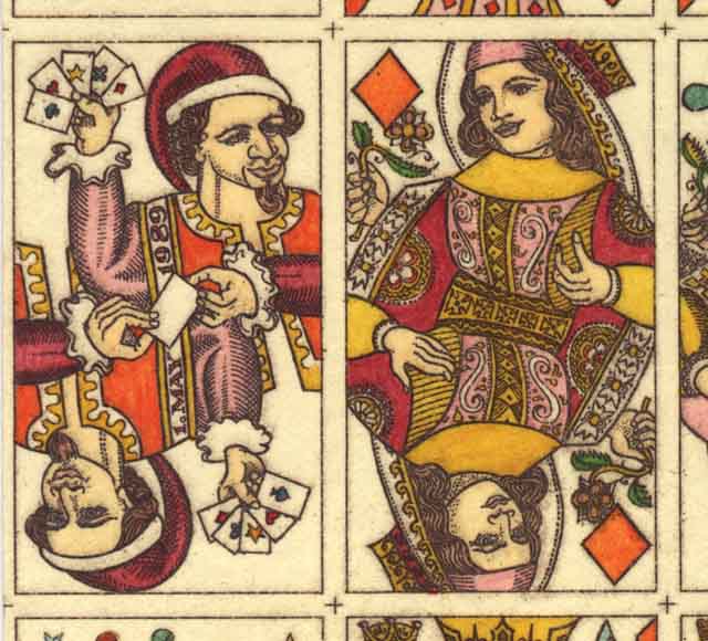 Double-ended courts based on standard English pattern but with variant colours; double-ended Joker p...