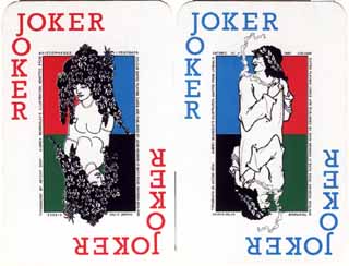 Other features are: both male and female double headed jokers (as far as we know for the first time) based on well known Aubrey Beardsley images - see below - and ornamented aces. The new colour cards have been used to publicise a simplified form of Bridge for children known as Mini-Bridge.