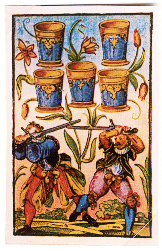 The cards are painted in gouache on thick card (175 x 87 mm), with burnished gold leaf, silver and tooled ornamentation reminiscent of the miniature paintings in medieval illuminated manuscripts and Books of Hours. There is also a resemblance, in the numeral cards, to the Mamluk cards seen in the previous page. This expensive and laborious process was, therefore, only affordable by the wealthy. However, in this way, the design of playing cards was influenced by the new spirit of Humanism, particularly in Italy.
