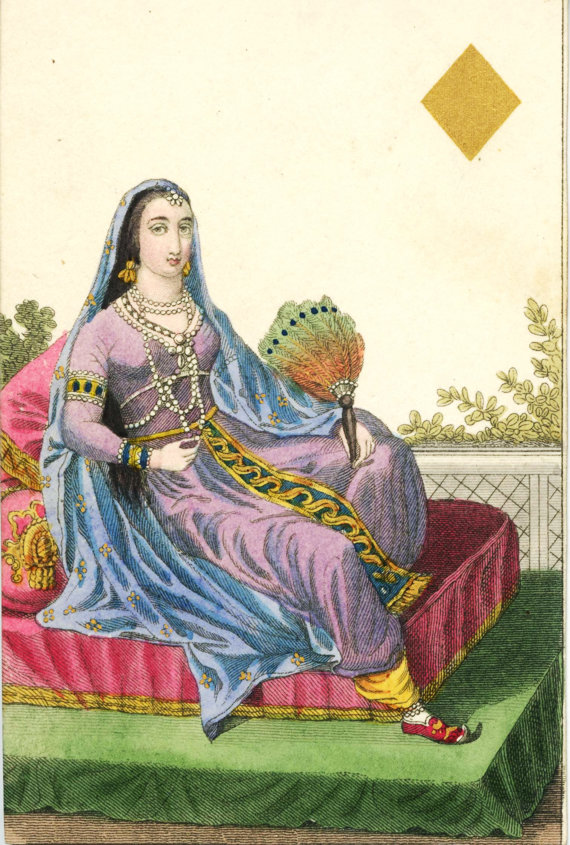 The court cards from the Hodges set are quite something too. In keeping with the maps and the geographical theme, they illustrate people from different nations around the world. Two of the Queens are shown above (and note also the unconventional suit signs (gold diamonds, green clover for clubs).