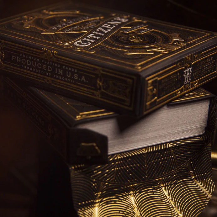 Brimstone - Metallic Gold Accented Card Deck: one of the first projects on Kickstarter which emphasised the use of metallic inks throughout the deck, which has become one of the standard features of the modern luxury deck. Brimstone was also one of the first playing card projects to reach over $20,000 on Kickstarter.