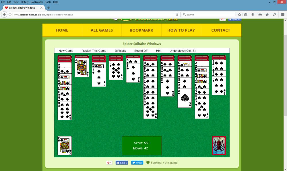 Spider Solitaire is a free web site offering users the chance to play various versions of the classic solitaire card game ‘Spider’ in which two packs of cards, shuffled together, are dealt out and the object is to make sequences of the same suit from Ace through to King, which are then removed from the board. If the whole board is cleared the game is won. The web site tracks the player’s score and the number of moves made, and handles the dealing and shuffling etc.