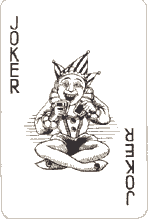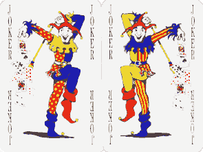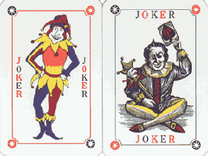 Above: Jokers from the replica of 17th century English playing cards, printed from woodblocks and hand coloured using stencils, designed and produced by Simon Wintle in 1987. Of course these "jokers" are anachronistic since jokers did not exist in 17th century packs.