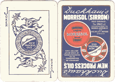 Above: Special Joker and reverse design for Duckham's motor oil, manufactured by De la Rue for Goodall, c.1925. The De la Rue standard Joker has been adapted for the purpose.