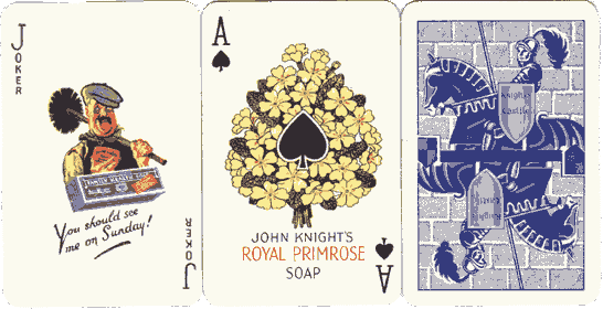 Above: Special Joker, Ace of Spades and reverse design for John Knight's Royal Primrose soap, by De la Rue, c.1926. The caption on the Joker reads 'You should see me on Sunday!'