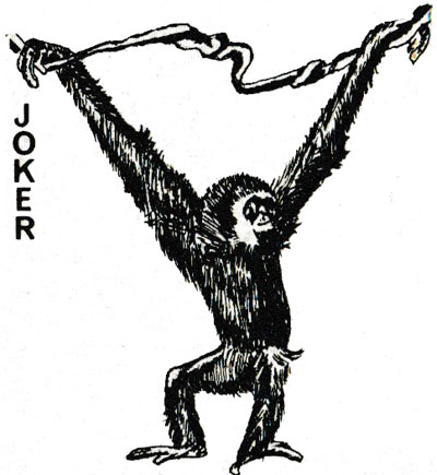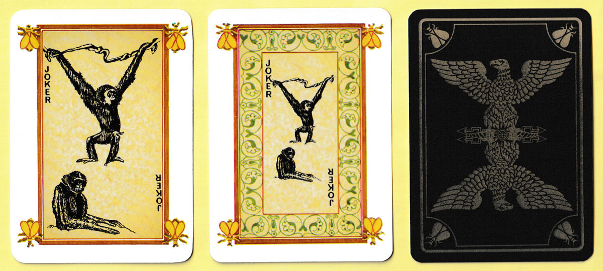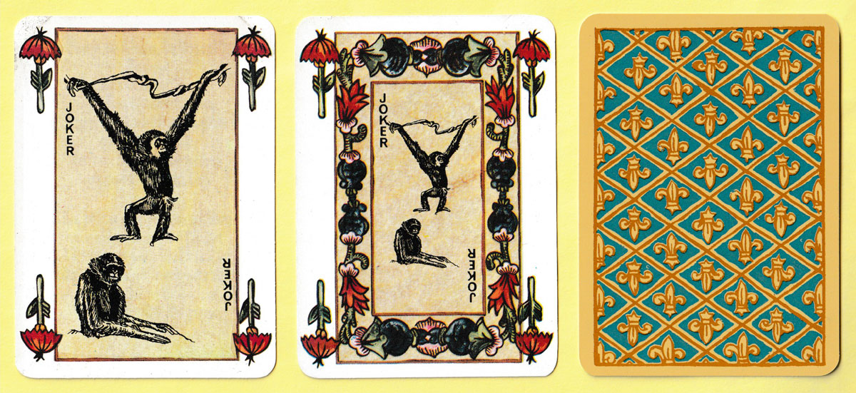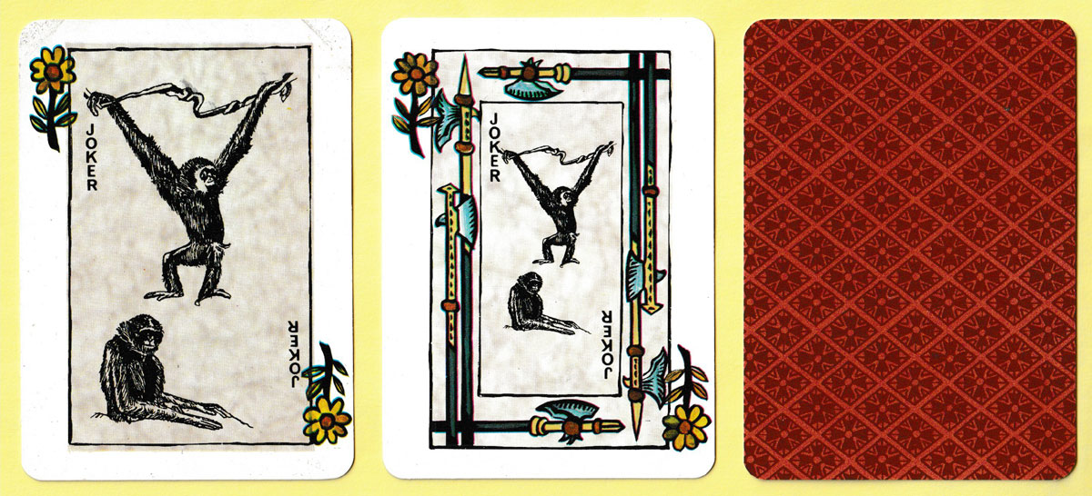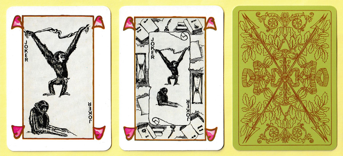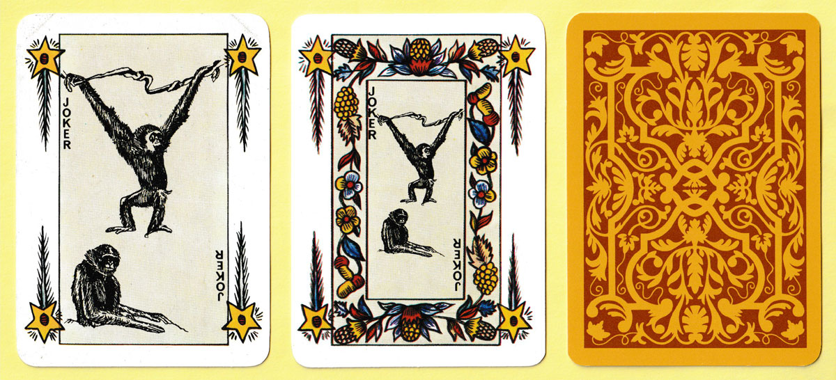 One of the publishers who was approached quite early on was Jean-Claude Dusserre in Paris (Editions Dusserre). He had reprinted a number of historic packs from the collection of the Bibliothèque Nationale in Paris. These were attractive and reasonably priced so it was decided to place an order for some of them. Jean-Claude Dusserre had a sales ploy which Stanley Gibbons could not resist: if an order was placed for 100 or more packs of any one item, he would create a special Joker design for inclusion in the pack. The gibbon, being a somewhat comical creature, was considered ideal for this purpose, while at the same time being a cryptic or coded way of showing that the packs had been made for, and for sale by, Stanley Gibbons!