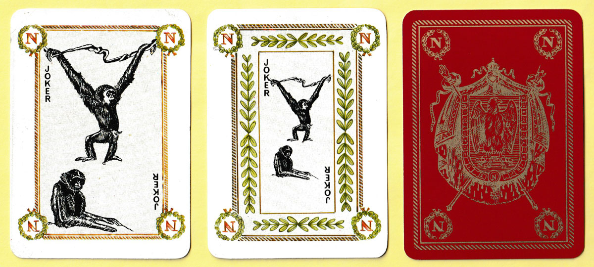 The final design shows two gibbons. It was used on the following six packs: Jeu Impérial Second Empire, Jeu des Philosophes de l’An II, Jeu Bonaparte, Jeu Henri IV, Jeu de la Pucelle, and Jeu Equestre Louis XIV. They are identifiable by the different symbols in the corners and by their respective back designs. None of the original packs would have had a Joker so, rather than leave the Jokers blank, Editions Dusserre often used to create special Jokers for different advertisers.