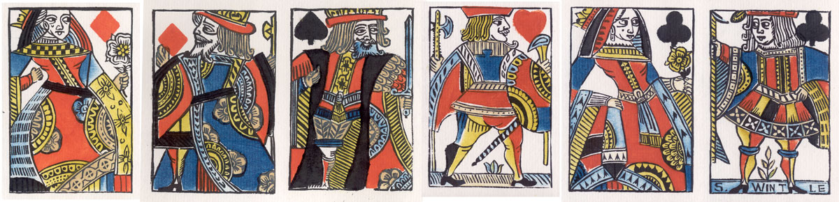 The cards were printed from copper plates, with the red suit symbols being applied later by stencil....