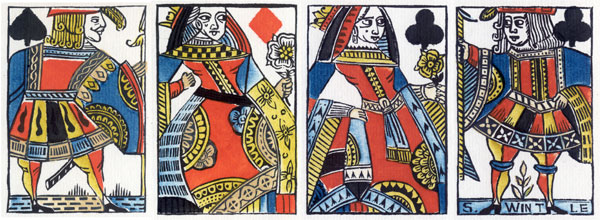 To explain: when copying from an earlier design, or adapting it to a different size or medium, the figures may become 'squeezed' into the desired shape by distorting the limbs, shortening the neck or ankles, and losing the proportions of the original figure, particularly if one is not a very competent artist. We can confirm that English cards are shorter and wider than their French counterparts. Furthermore, when cutting out the designs on the woodblock, perhaps intent on finishing as soon as possible, finer features of the design will be simplified, ignored or removed in which case the design may become corrupted or modified. English playing cards often look as though this sort of thing has happened. The stencilling is often slap-dash which further obliterates the designs. These reductions in quality are probably due to cost-effectiveness: there is often a sense of expediency. Did this matter?