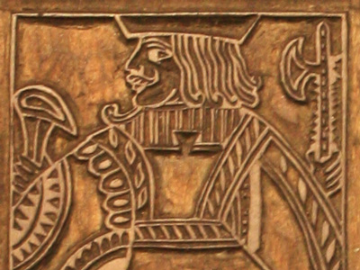 The next decision was the model for the court cards. I chose the seventeenth century designs of Hewson, which exemplify the 'English' style which had crystallised by then. Hewson's cards seem very formal and exhibit that geometric construction which characterises the English pattern, as opposed to the earlier cards which had been imported from the continent (by card makers such as Valery Faucil, Pierre Marechal, Jehan Henault, Anthoine Le Cornu, etc.)