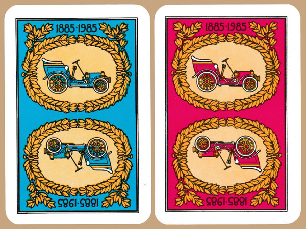 Above: the original pack printed by KZWP is called "The Birth of Motorization 1885-1985" or "Stulecie Motoryzacji 1885-1985" in Polish. The backs depict a vintage car within a wreath at both ends. Later on, Mercedes Benz used this pattern for their promotional gift packs.