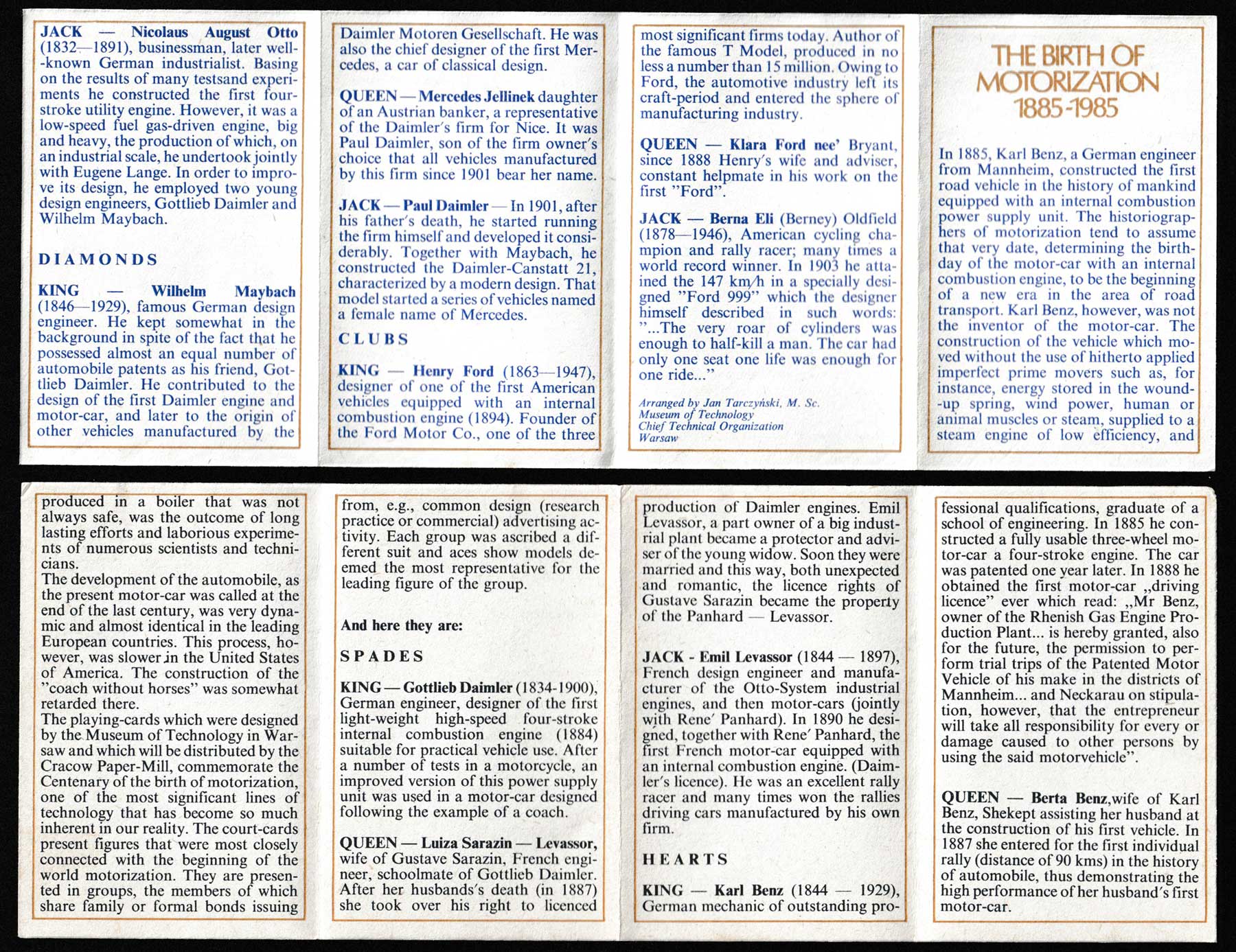 The Birth of Motorization playing cards (Stulecie Motoryzacji 1885-1985) were designed by Mr. Radoslaw Radziejewski to commemorate the 100th anniversary of world motorization (1985).