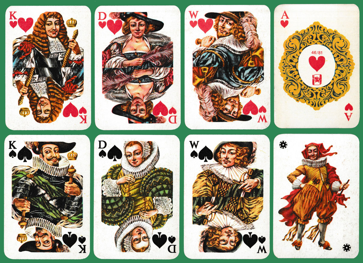 The Baroque style was flamboyant and exuberant, as typified by the court cards in this pack. They are, to use modern parlance, ‘full-on’ and ‘in-your-face’ – so much so that the headgear of several of the courts has been chopped in order to fit the designs on the card. The King of Diamonds looks especially forbidding. The manufacturer’s logo and the date appear on the Ace of Hearts. The Joker is a full-length jester in a fiery red and orange costume. The indices are in Polish (K, D, W, A). See the box►