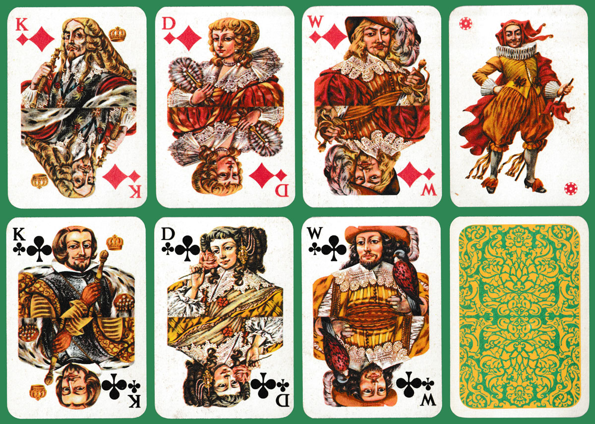 Above: ‘Barok’ playing cards nr 232 printed by KZWP, Kraków, Poland, 1981. 52 cards + 2 Jokers in a cardboard ‘book-type’ container made to hold two packs. Size: 64 x 92.5 mm.