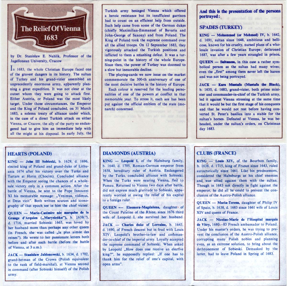 “Relief of Vienna” playing cards issued on the occasion of the three hundredth anniversary of the raising of the siege of that city, by Polish forces, from the invading Ottoman forces in 1683. The colour scheme for each suit reflects the leading personalities of the powers at conflict. Each Ace has the official emblem of the state concerned: spades = Turkey; diamonds = Austria; clubs = France; hearts = Poland. The design was by Maria Orowska-Gabry, with historical advice from Prof. Stanislaw Nahlik. Manufactured by KZWP, Cracow.