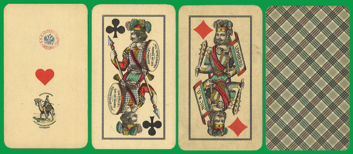 Around 1890, the company NIL Spielkartenfabrik was founded in Lemberg (at that time in the Kingdom of Halych, part of the Austro-Hungarian monarchy). Along with the change of state structure in Central Europe after World War I, the city became part of the Polish state under the name Lwow. Probably at this time, the original company was also transformed into the new name Karpalit S.A. in Lwów (KARPALIT Spółka Akcyjna dla Fabrykacji Kart do Gry, Wyrobów Papierowych i Przemysłu Litograficznego / Joint Stock Company for the Manufacture of Playing Cards, Paper Products, and Lithographic Industry). The manufacturer kept the original logo with the dromedary . The history of the company probably ends with the Second World War. Today, the city of Львів is part of Ukraine.