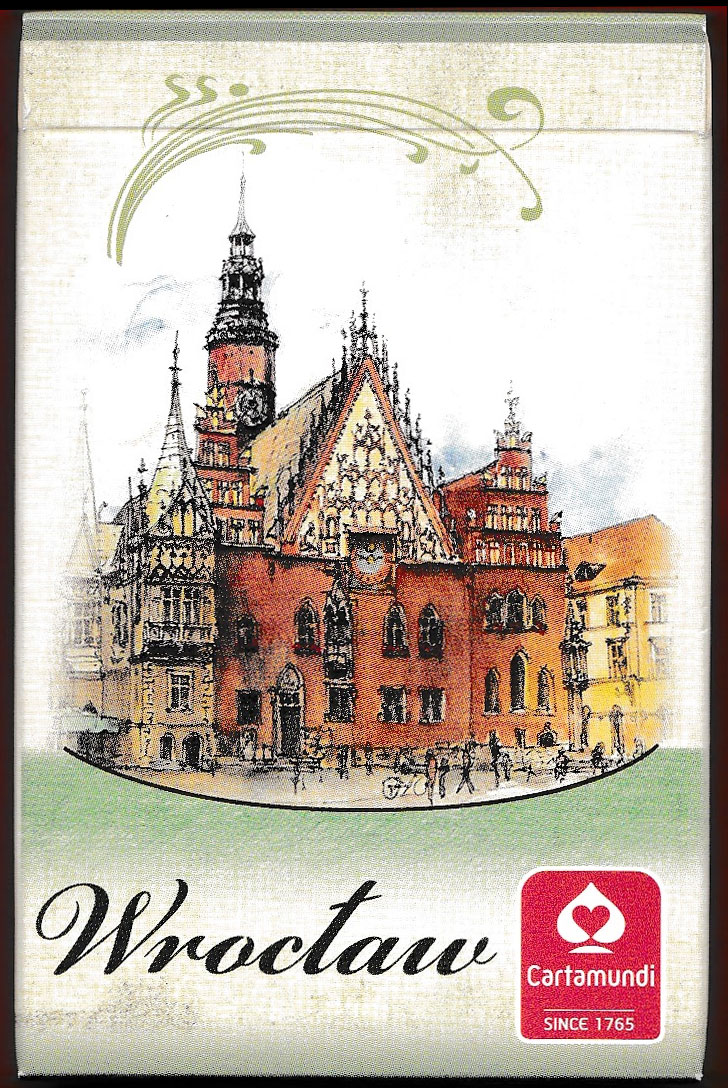 The court cards and aces of this pack display delicate and attractive watercolour paintings of historic Wrocław. Descriptions of each building and location are given beneath each painting in Polish, English, German and Russian. Three jokers complete the pack. The artist and designer is Katarzyna Tomala (who was also responsible for the artwork in the Polska pack published in 2011). This pack too was published in 2011 by Cartamundi Poland. See the box►