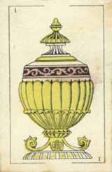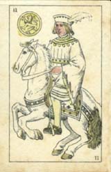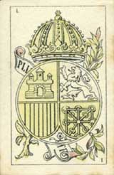 Apeles Mestres was a Catalan painter-illustrator who worked from the end of the XIX century into the early XX century. His designs for a pack of playing cards were originally produced by Dondorf of Frankfurt in around 1902. The version shown on this page, published by Costa y Valerio in around 1905, was printed in outlines only, and has been partly hand-coloured with watercolours. |