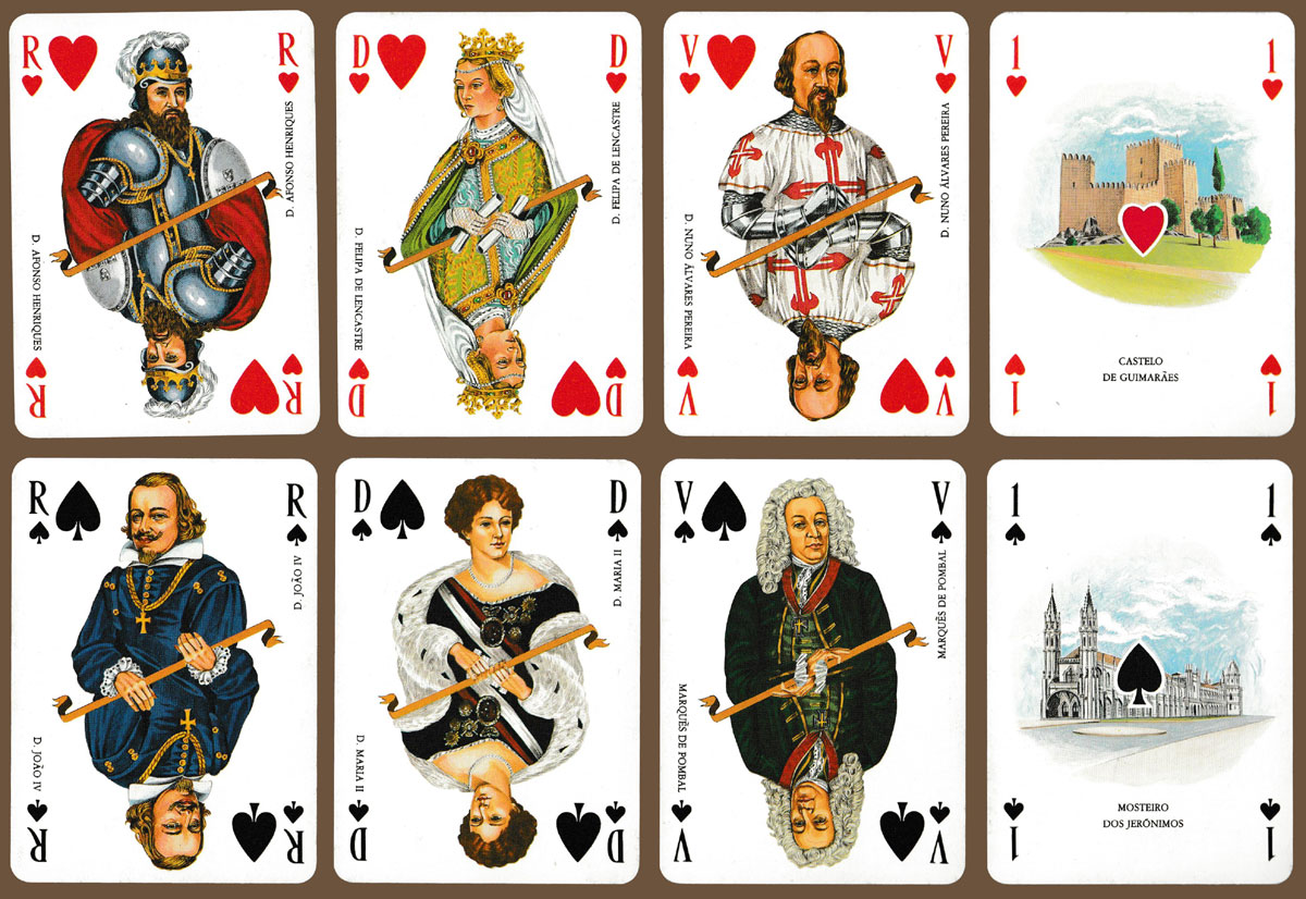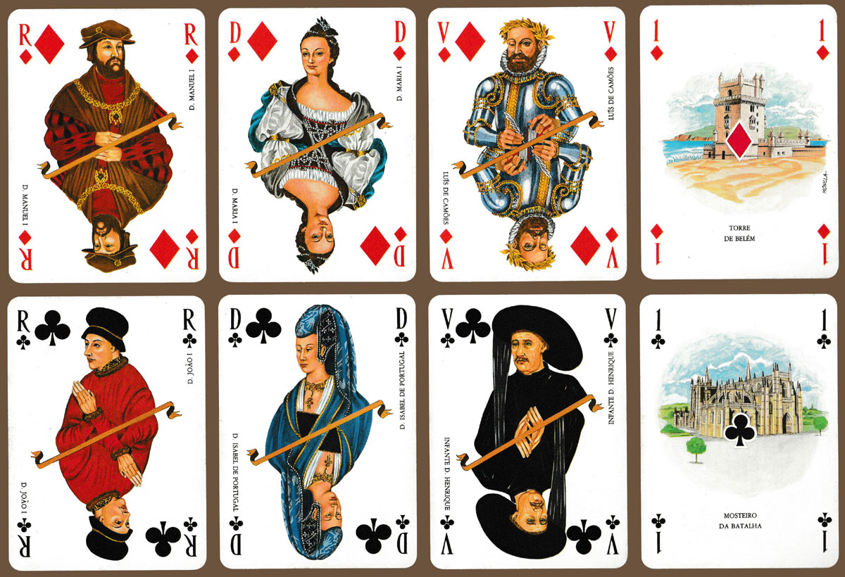Banco Borges & Irmão was founded in Porto in 1884. For its centenary this special pack was produced, portraying figures from Portuguese history. Each one is named but without their respective dates. The courts are double-ended, divided diagonally. Different historic sites are depicted on the Aces. The Ace of Diamonds appears to carry the designer’s name (MONCLA or MONGLA?). One of the two Jokers has a list of the bank’s branches in the Paris region. The bank itself was taken over in 1996. See the box►