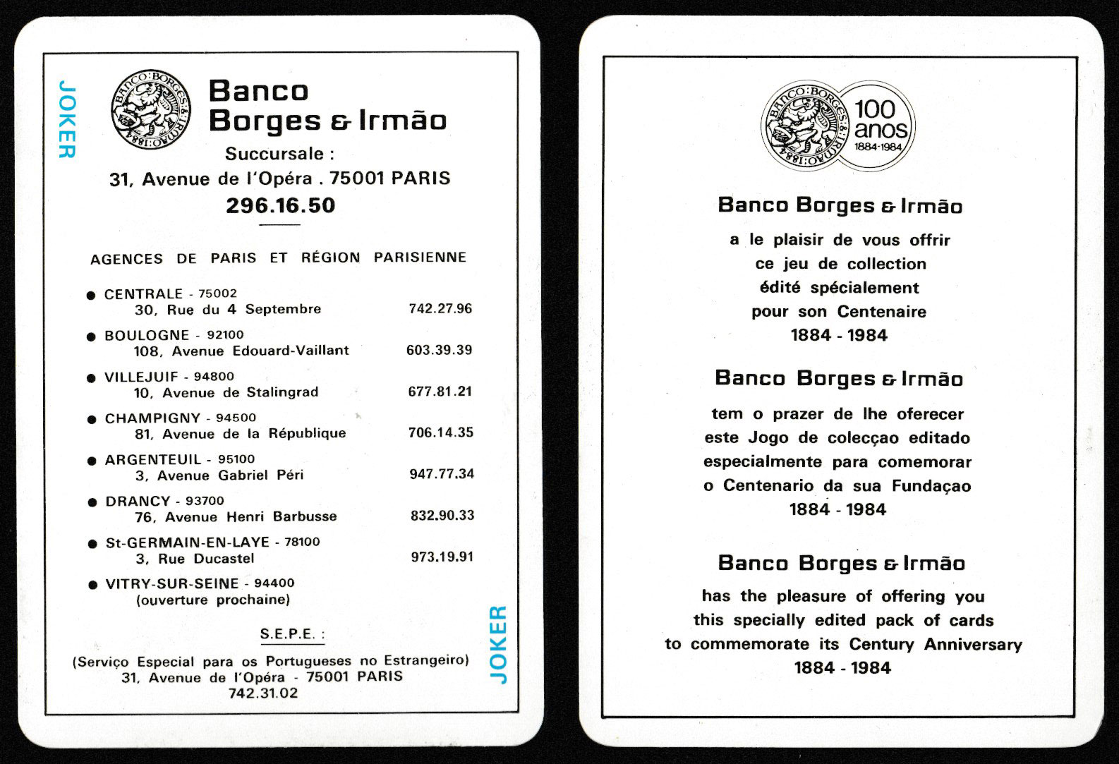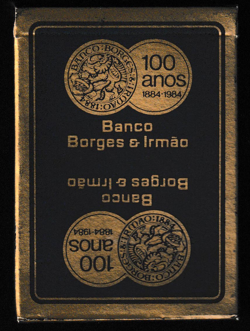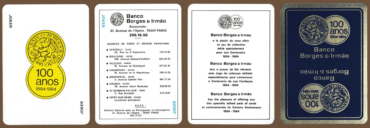 Above: Banco Borges & Irmão centenary playing cards printed by Maitres Cartiers Boéchat Frères and published by Editions J.C. Dusserre, Paris, France, 1984. 52 cards + 2 Jokers + 1 extra card in tuck box. Size: 63 x 88 mm. The design on the box is the same front and back. Click the two information cards to zoom.