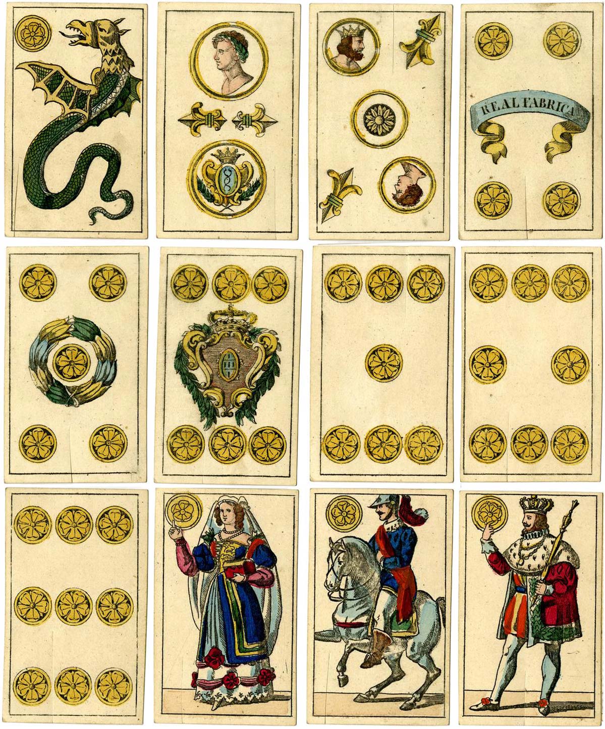On the 4 of coins is a scroll which reads "Real Fabrica", presumably the Impressão Règia, Real Fábrica de Lisboa. The bright gold-coloured coins are designed with 5-petalled flowers, apart from the 2 & 3 which contain busts or a heraldic device. Shields or escutcheons appear on most of the intercrossing sword and club numeral cards. The figure on the two of clubs, wearing a plumed hat, is of archaic origin. The cups are chalices; the four has a scroll with no inscription, the 6 having the initials "F.B." interlaced and repeated in reverse, with a crown above, possibly made to resemble that of the Real Fábrica de Lisboa. There are no 10s: numerals 1-9 and 3 courts per suit = 48 cards.