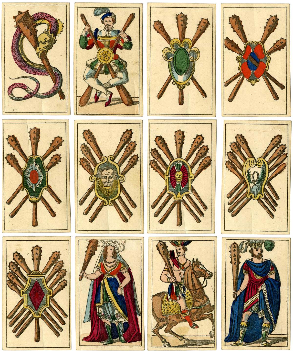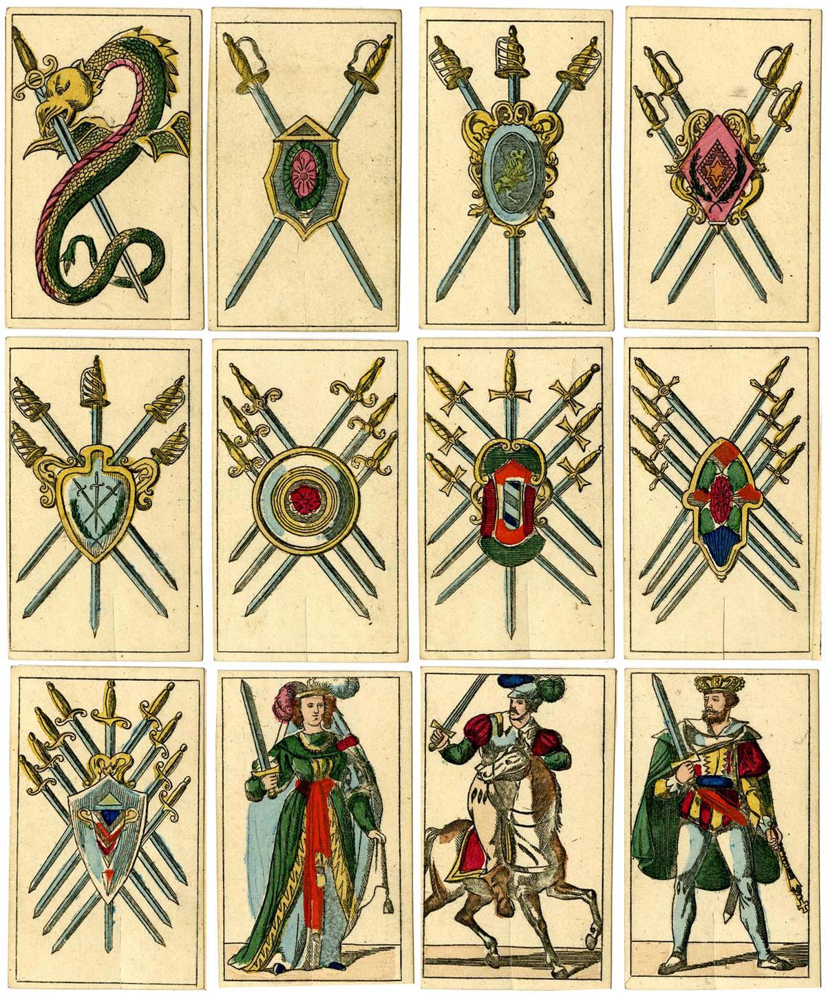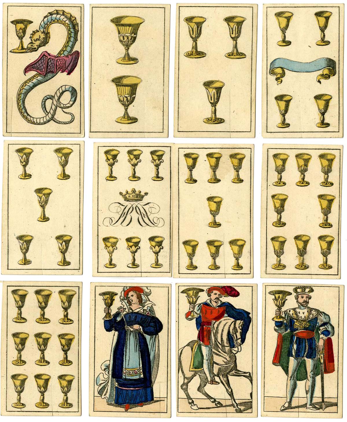 This splendid pack from the British Museum collection, with serpents or dragons on the aces and with court cards wearing theatrical costumes, may be seen as a later version of the ‘Portuguese pattern’. The kings are standing. The female court cards are not queens, but female maids or ‘sotas’, a feminine word. They have no crowns and rank below the knights. Whilst the maid of coins carries a small coffer, the other three carry only their suit symbol. There are no ‘pintas’ or breaks in the frame lines, which of course suggests a destination other than Spain. However, this pattern was by no means confined only to Portugal.