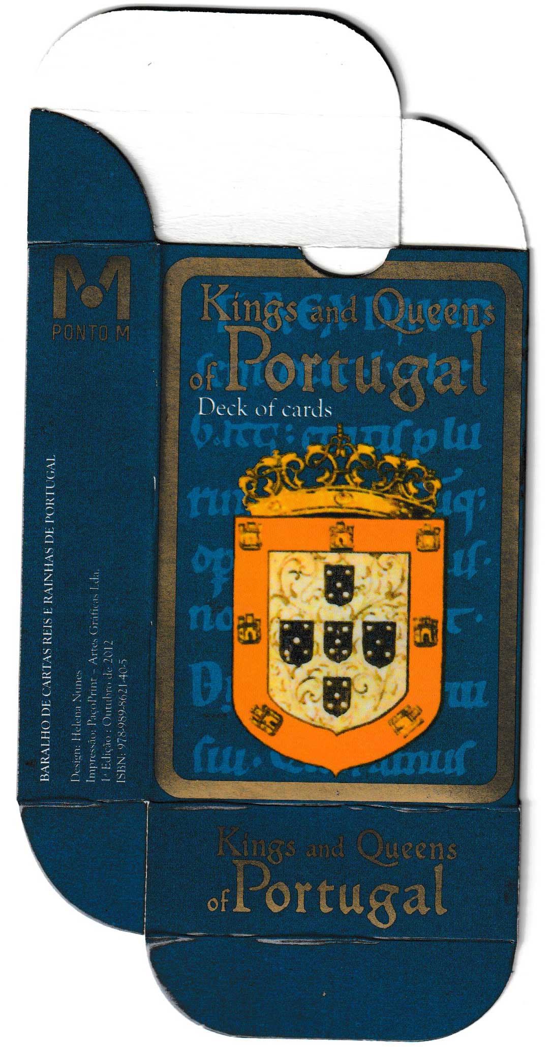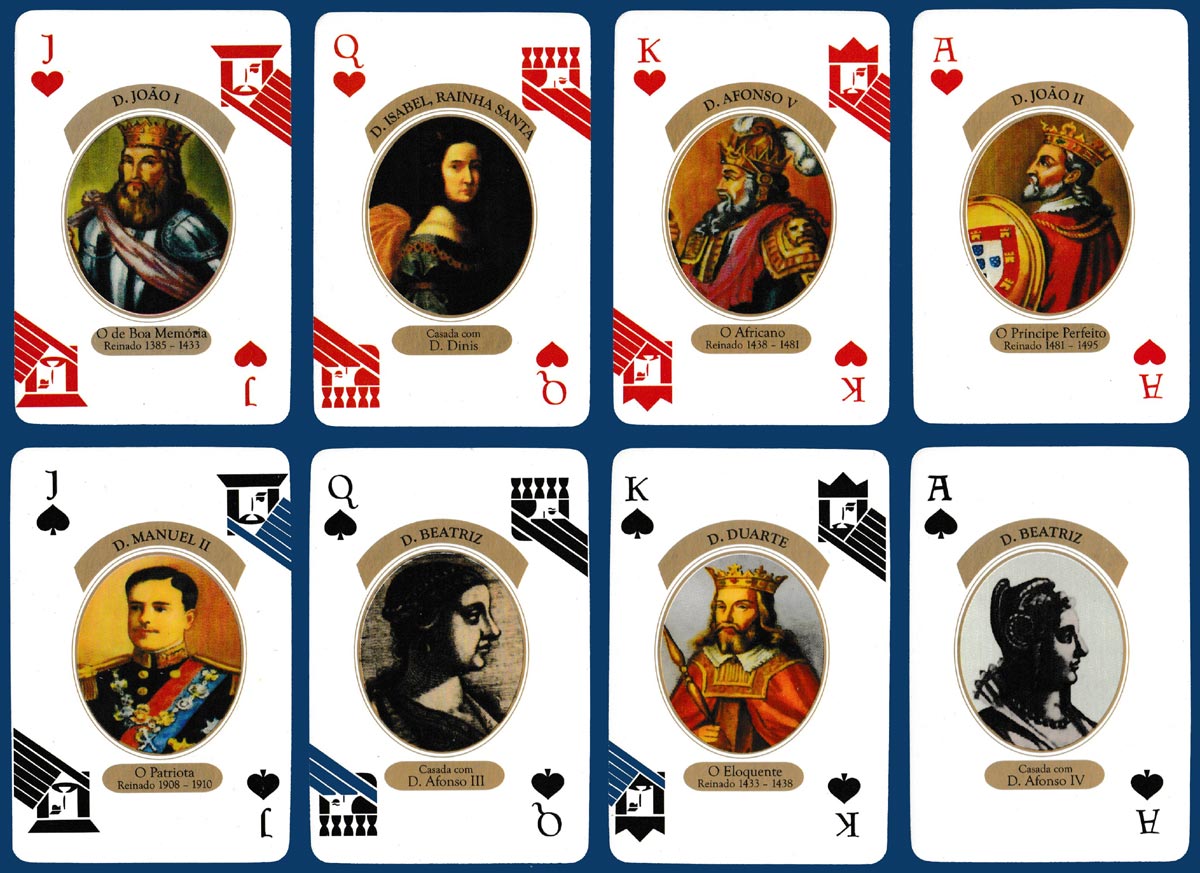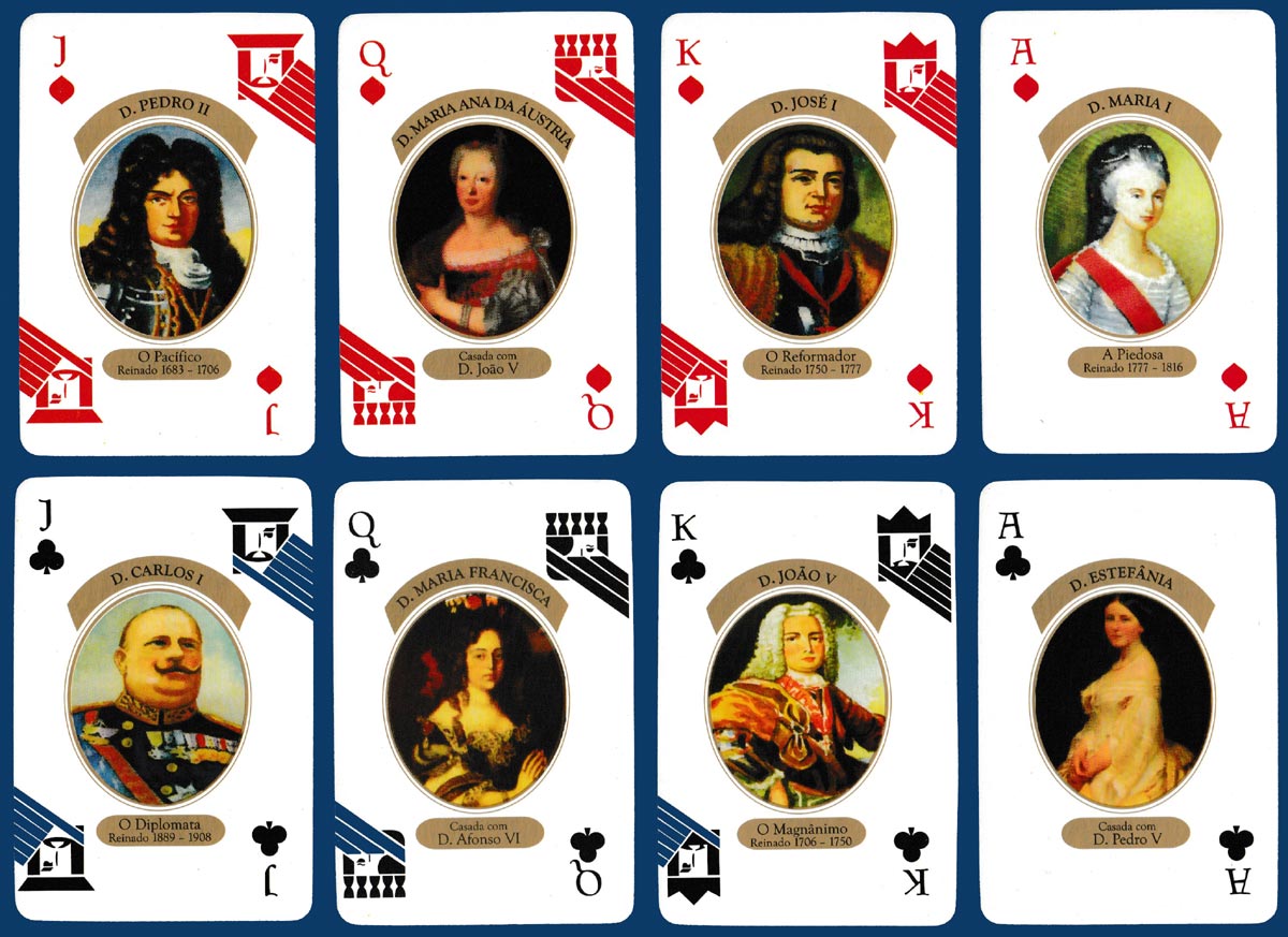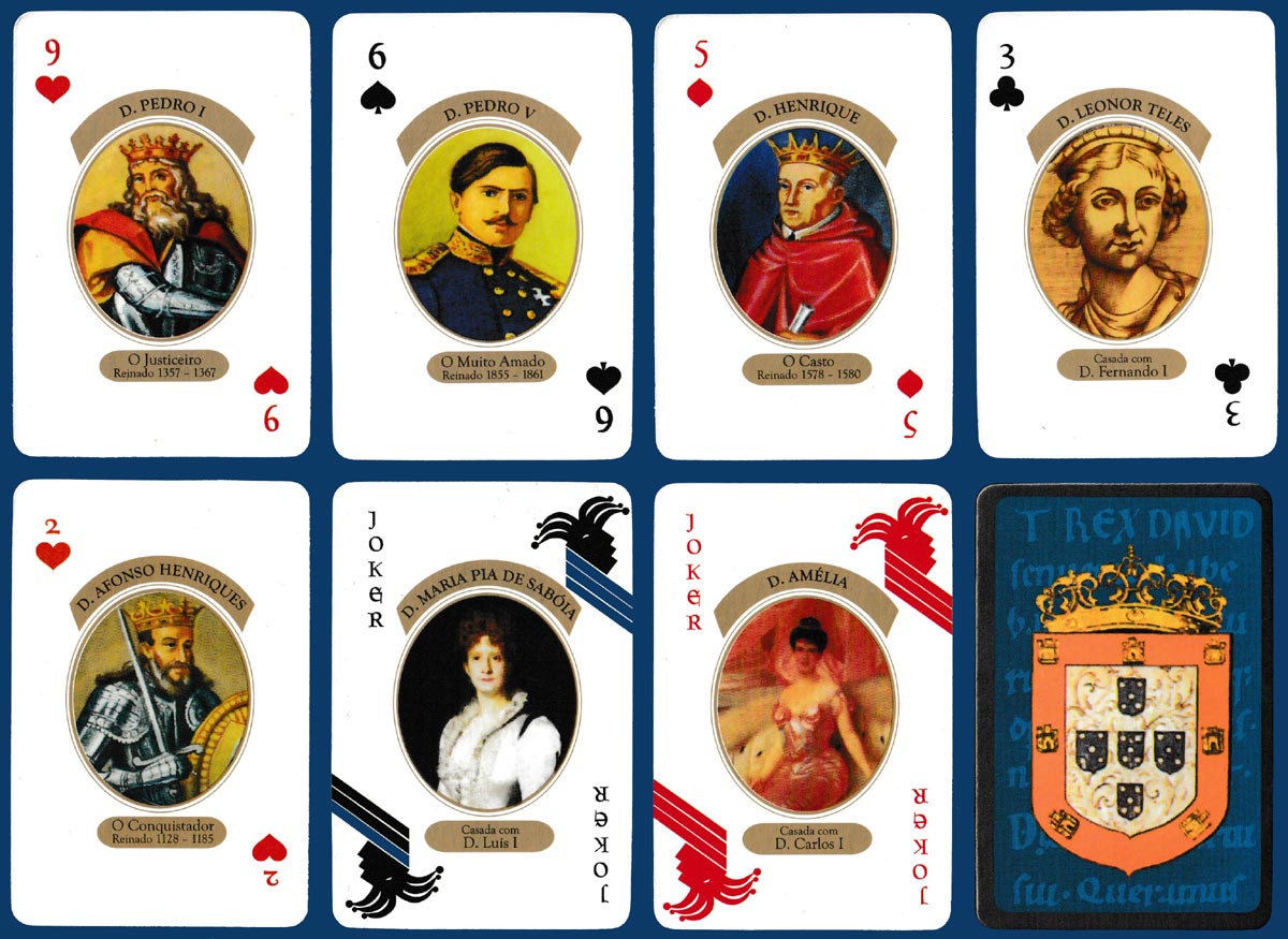 Above: Reis e Rainhas de Portugal (Kings and Queens of Portugal) playing cards made by PaçoPrint - Artes Gráficas Lda, Penamaior, Paços de Ferreira, Portugal. First edition, October 2012. 52 cards + 2 Jokers in tuck box. Size: 61 x 90.5 mm. The box is the same on both sides apart from the text (one side in English, the other in Portuguese).