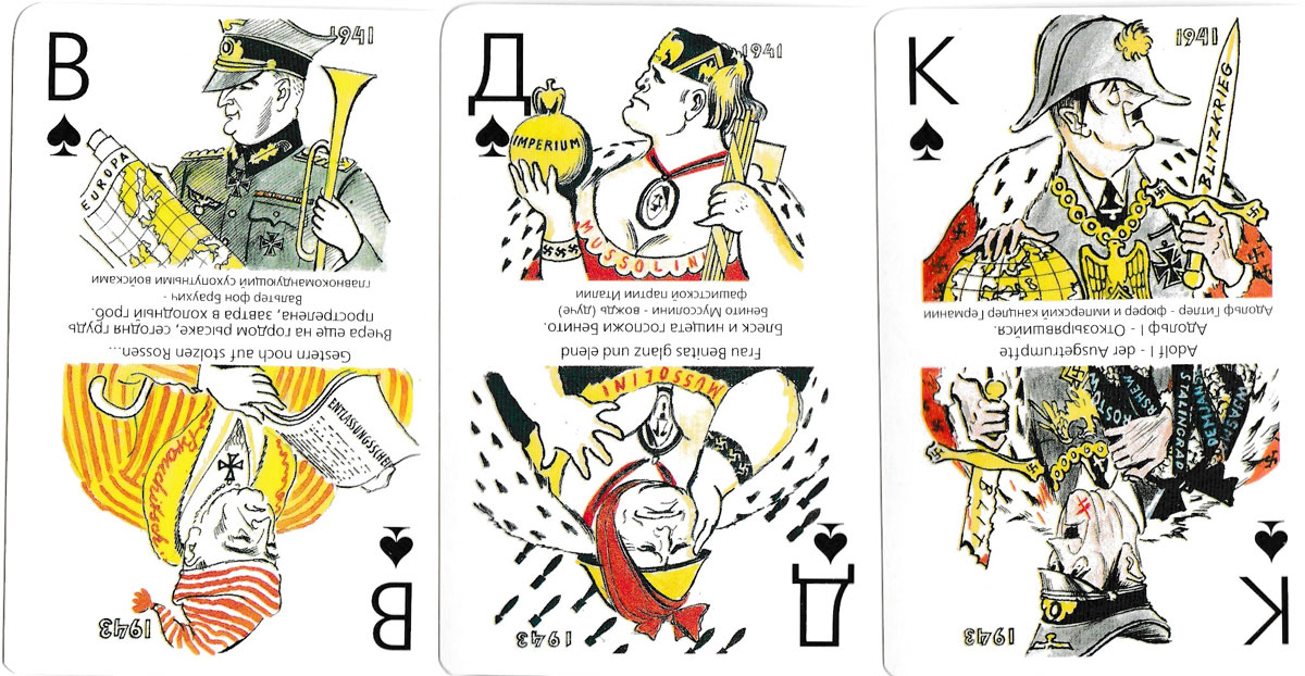 Slavonic was produced in 1928, but the first Soviet cards with original satirical designs appeared in the 1930s; the anti-religious pack, designed by Sergei Levashev, appeared in 1934. Followed by an Anti-Fascist pack, designed by Vasilli Vlasov, in 1942. Another Anti-Fascist pack was designed in 1943 by war artist Ivan Ivanovich Kharkevich (1913-2007) but was not printed until 60 years after in 2003.