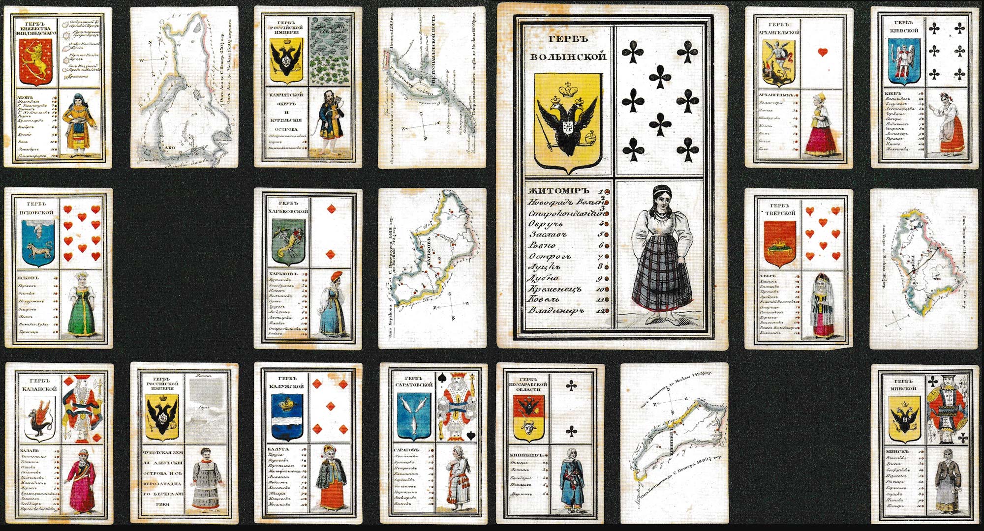 Another early pack was the Geographical pack of Russia by Konstantin Gribanov, with each card divided into four quarters, displaying the coat of arms of one of the Russian provinces, a playing card, costumes, and a list of towns. It was intended to familiarise children with the geography of the country.