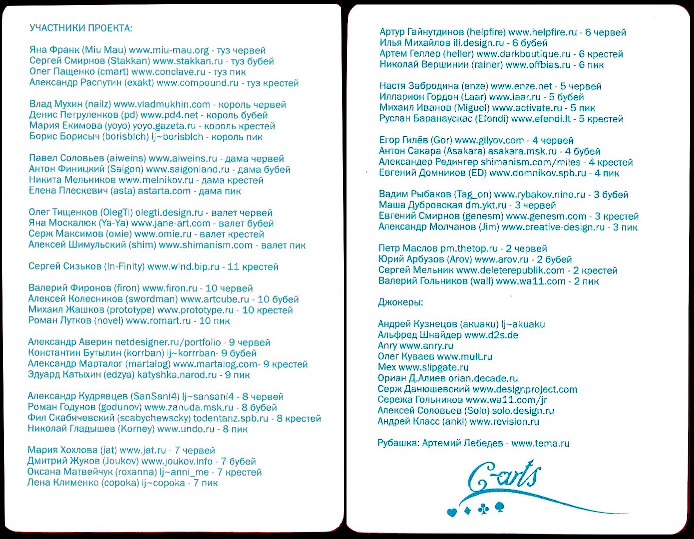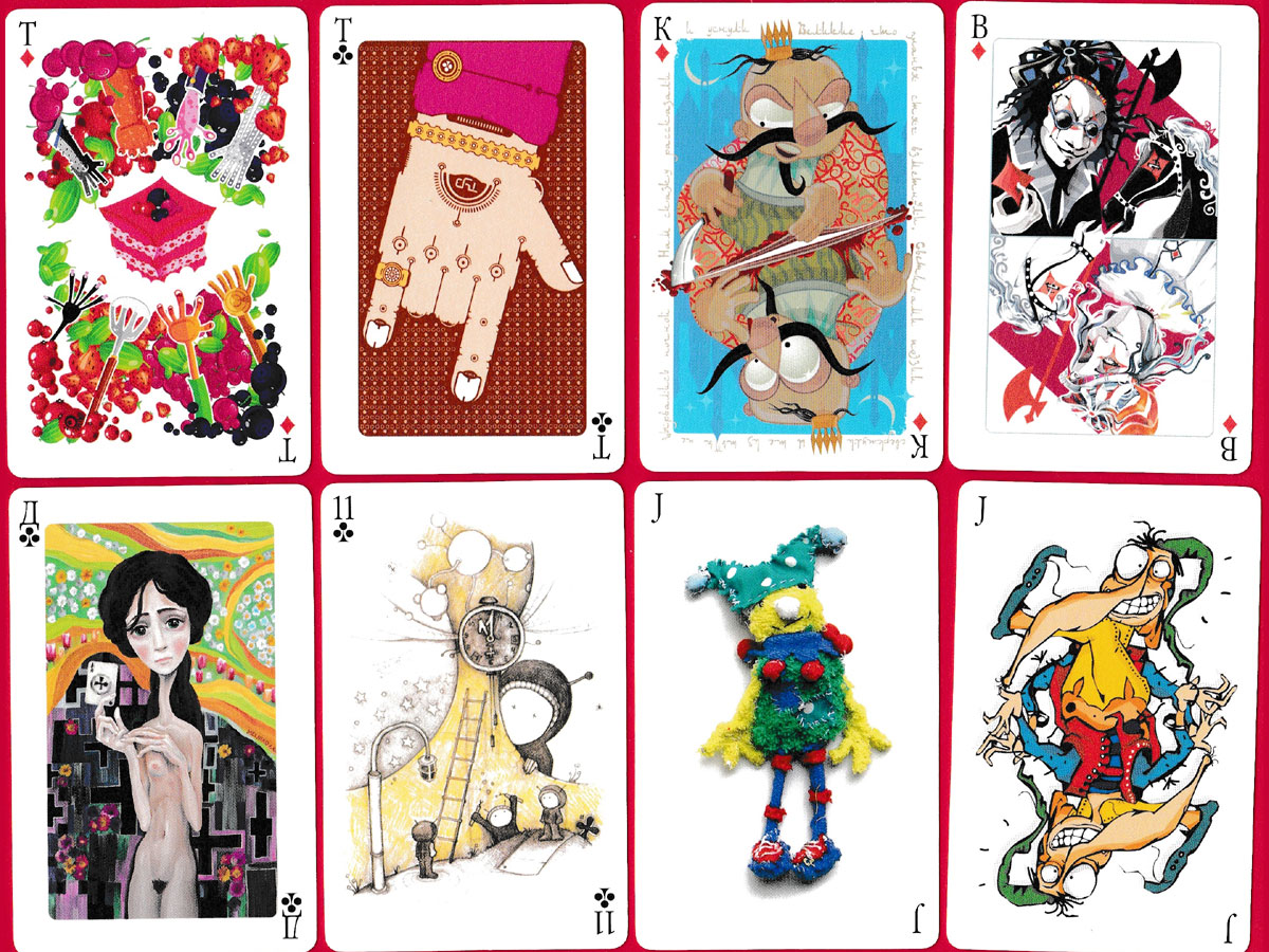 This pack of 52 cards and 10 jokers was produced in the summer of 2003. Sixty-three artists, illustrators and designers worked together, with each creating one card in their own particular and unique style. The sixty-third card takes the form of an extra 11 of clubs. The pack comes with an extra card which lists every card and the name of the artist responsible. The jokers were drawn by major figures of Russian design and illustration, including the Russian-Israeli artist Oleg Kuvaev and Aleksei Solov’ev. The card back was designed by Artemii Lebedev. See the extra card►