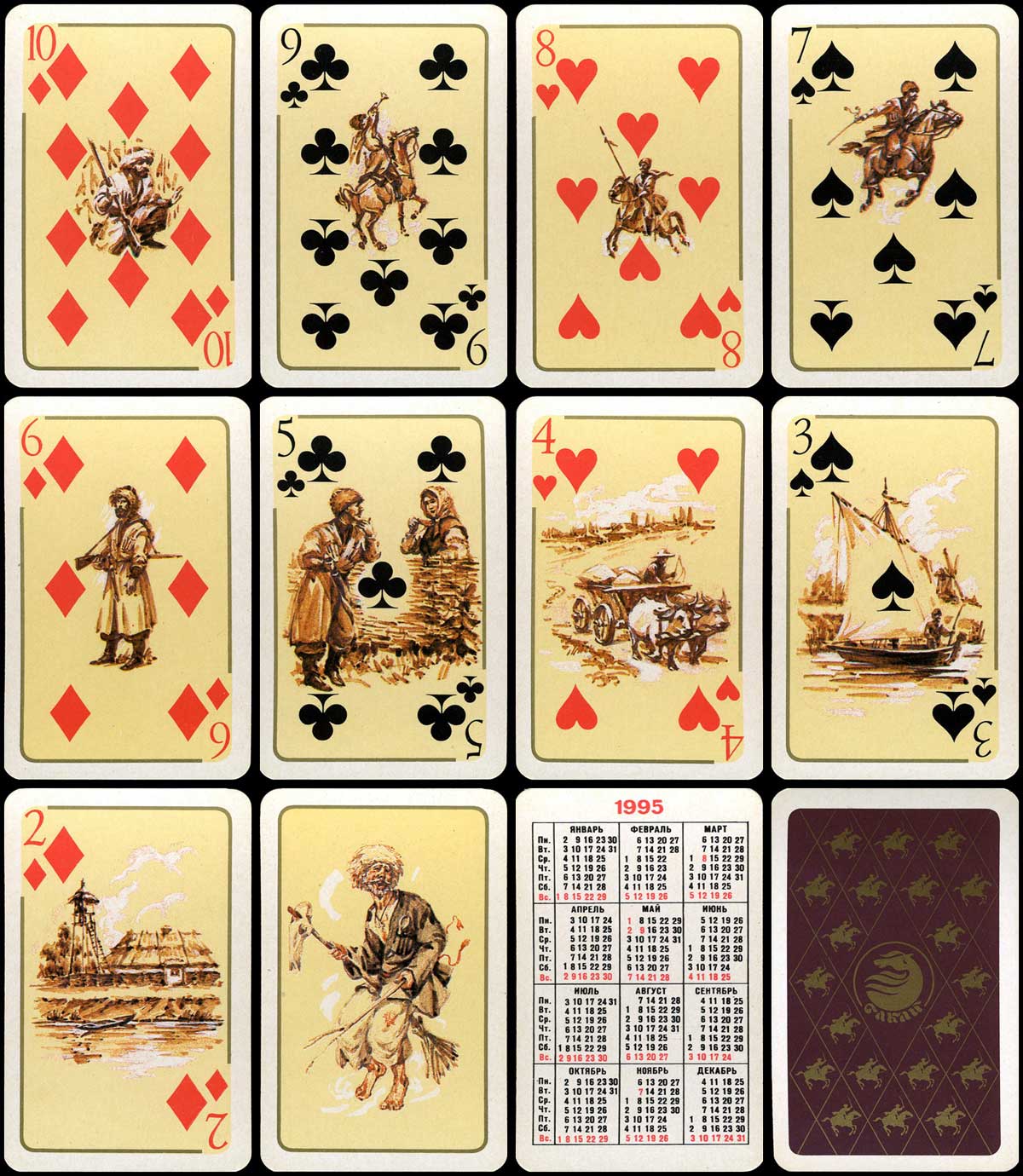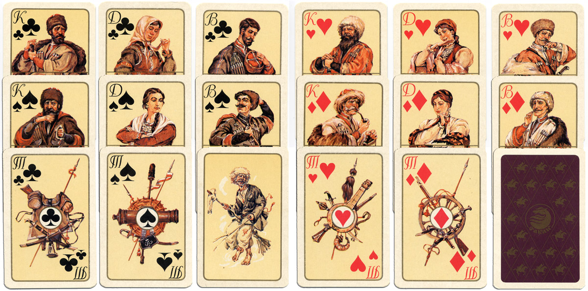 Artwork by O. Panchenko dedicated to the revival of the traditions of the Kuban Cossacks or Kubanians, who live in the Kuban region of Russia. Printed by the Colour Printing Plant, St Petersburg, 1994. This pack of cards appeared on the initiative of the publishing house “Bakay” situated in the Cossacks’ village Kanevskaya of the Krasnodar Territory.