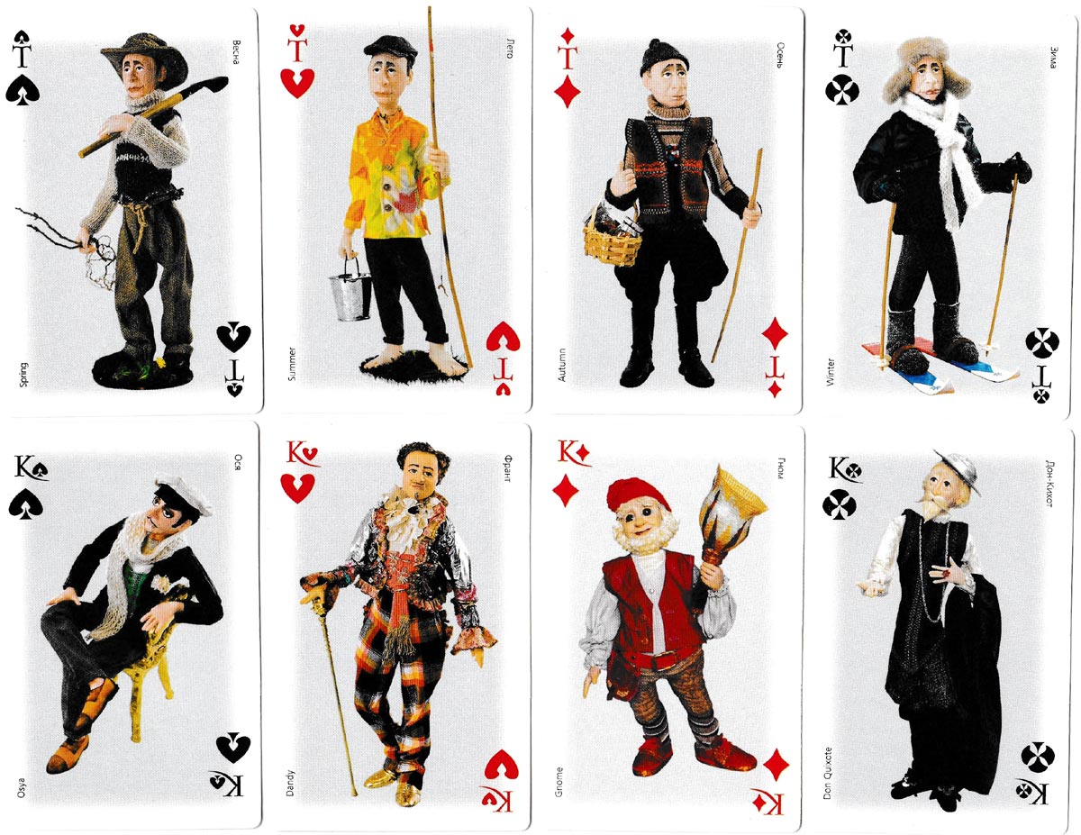 This 36 card pack (no Jokers) was published in 2003 by the Dolls Gallery founded by St. Petersburg artist Varvara Skripkina. The court cards (all named) portray dolls or puppets from the Gallery, while the Ace of each suit portrays a Vladimir Putin doll in different clothing according to the season: winter (Clubs): Putin going skiing • spring (Spades): Putin the farmer with a shovel • summer (Hearts): Putin going fishing • autumn (Diamonds): Putin going to collect mushrooms.