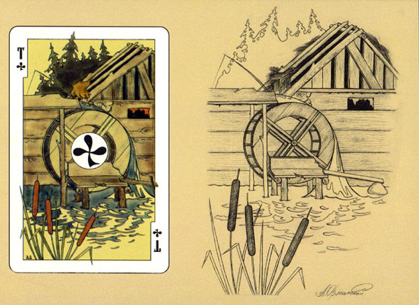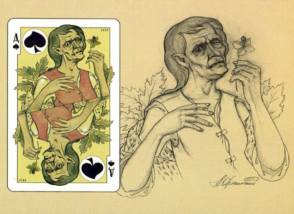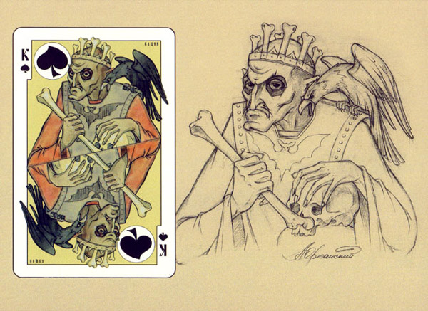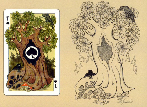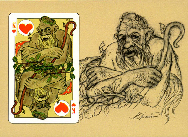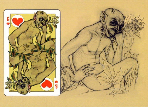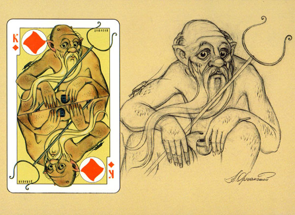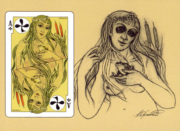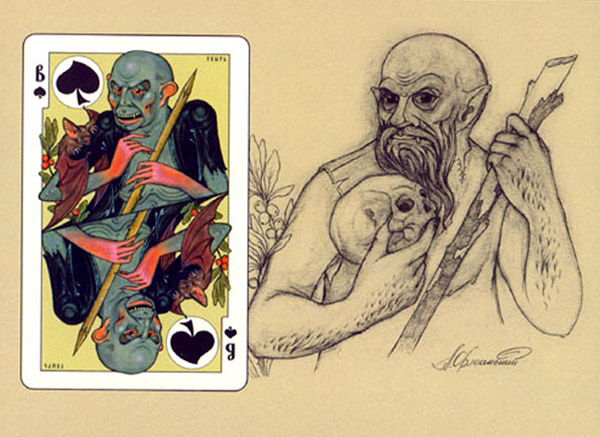 The creatures in the deck, subtitled “the Evil Force”, are derived from popular Slavonic mythology, kept alive from pagan times as an integral part of the national culture, and which exist in Russian folktales and other literature. Besides children enjoying these wonderful stories before bedtime, these stories have also been valued by adults for the many great lessons that they teach. Aleksey Orleansky has depicted a menagerie of ghosts, water nymphs, spirits, demons and other malevolent beings which crawl out of the water in the middle of the night to entice, torture or suck people into the swamps. However, they also appear to spend a lot of time just chilling, smoking pipes or loitering at the water’s surface. The numeral cards (see below) show wild animals, insects, birds and other creatures.