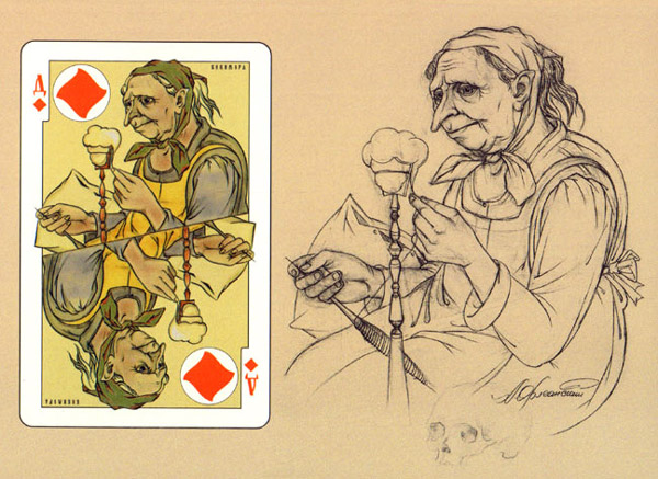 Playing cards depicting imagined residents of St. Petersburg with illustrations by Alexei Bobrinsky....