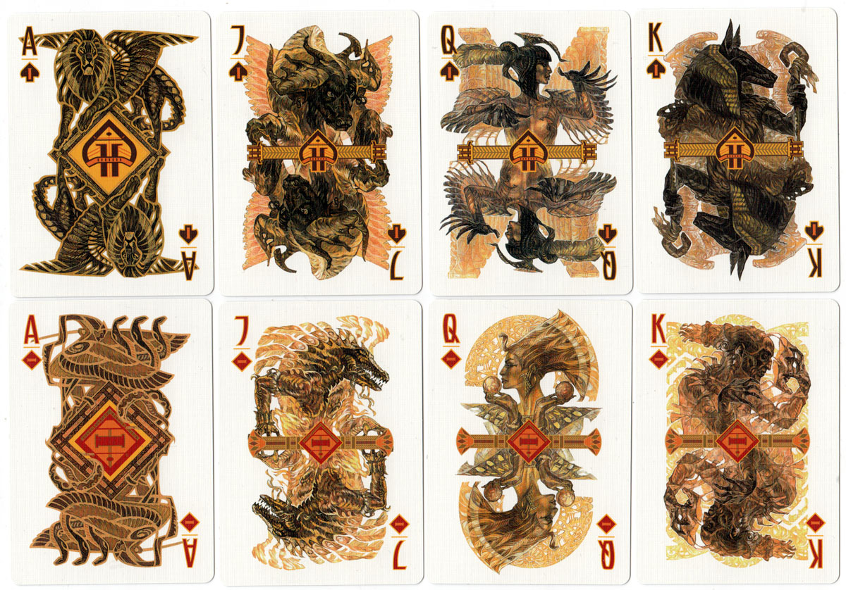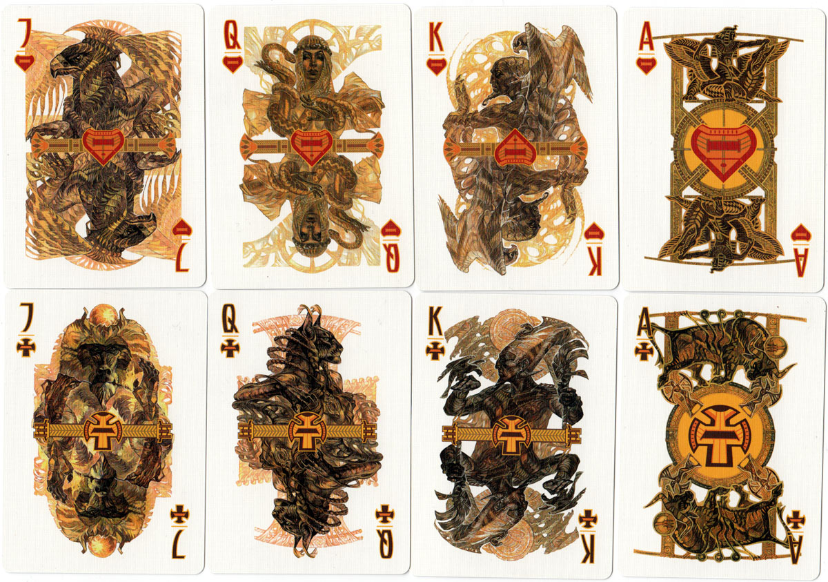 Ancient Egypt had a complex belief system that merged magic, religion and the afterlife, and this is what has motivated the idea of this fantasy deck. “Powerful magicians who ruled the earth and sky ... potent sorcerers and shape shifters, lords of beasts as well as men”. The custom court cards, which took three years to complete, attempt to personify mutating, shape-shifting figures, the essence of sorcery and magic - from the Kickstarter description►