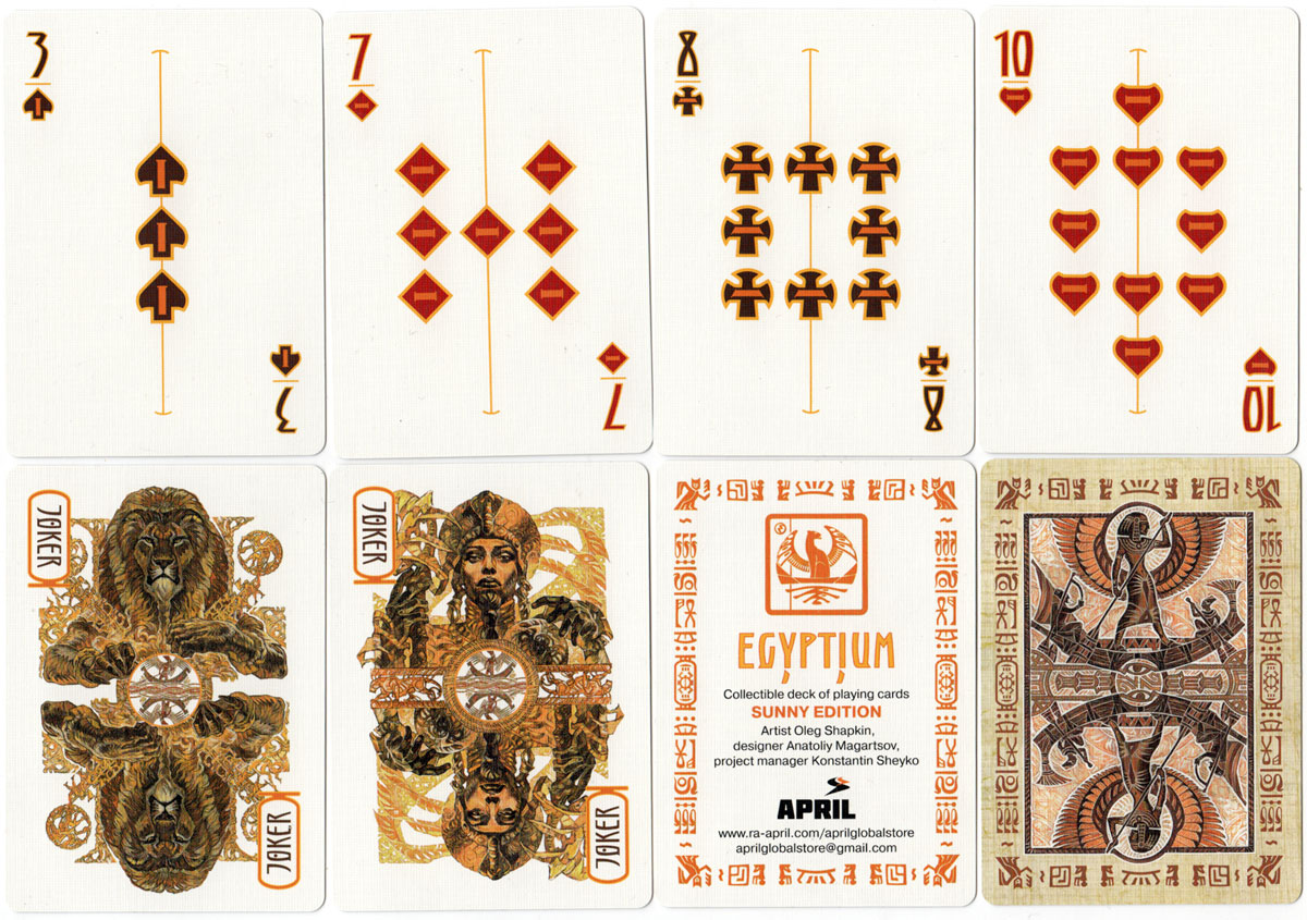 Above: “Egyptium” fantasy playing cards with artwork by Russian artist Oleg Shapkin, printed by Nage Cards, 2021. 52 cards + 2 jokers + extra card in box.