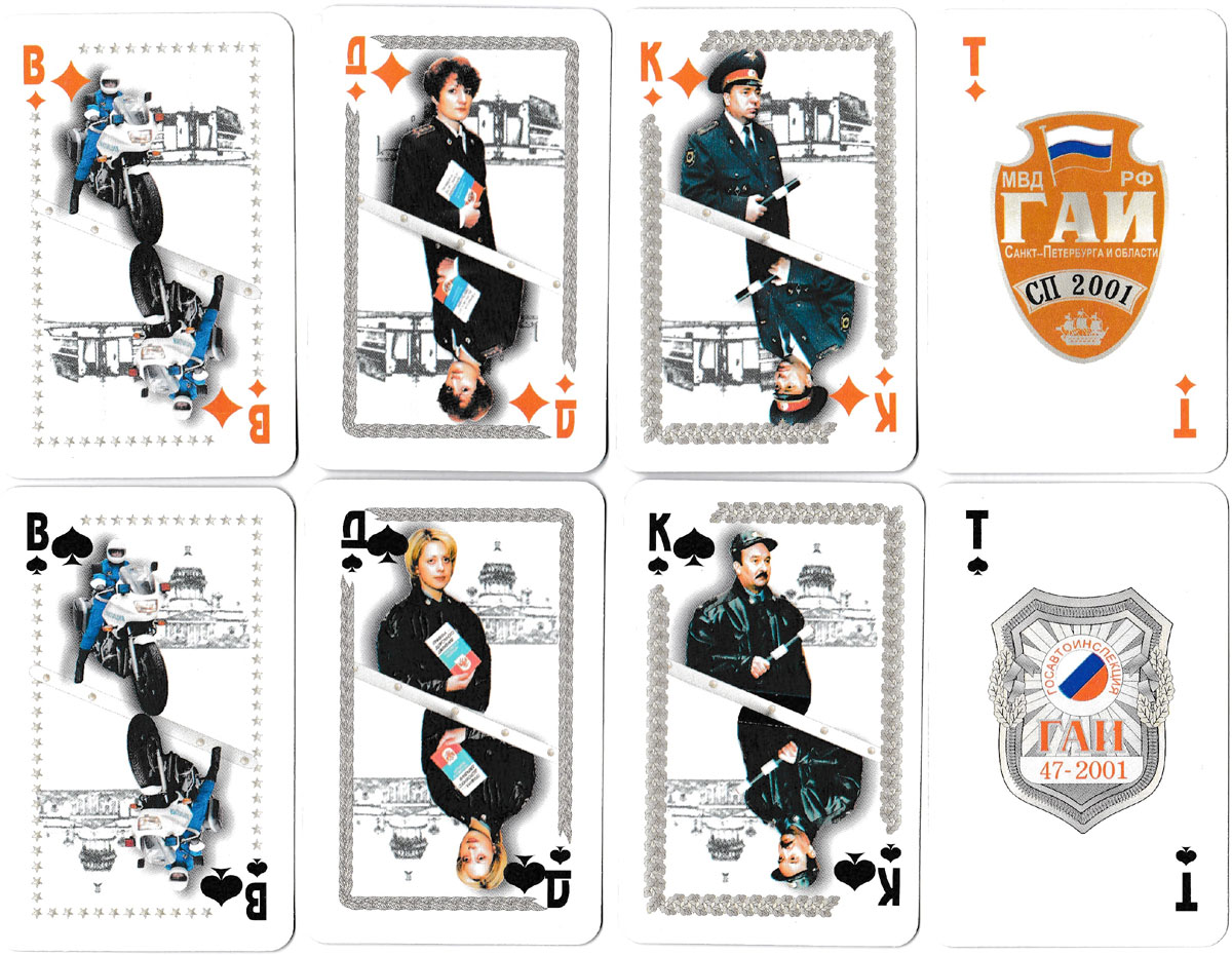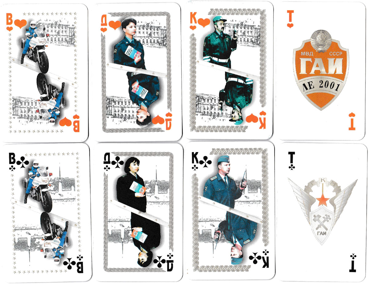 In translation the title of this pack is “The State Automobile Inspection of the Russian Federal Road Safety Service”. This 36-card pack was published in 2001 by the Kombinat Tsvetnoi Pechati to honour 65th anniversary of the founding of GAI (the State Automobile Inspection) of the department of the Ministry of Internal Affairs. The aces show badges of the different regional offices of GAI, the court cards show operatives against a different background in each suit.
