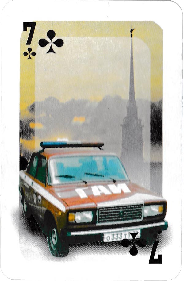 The 10 pip of each suit shows a blue DPS (Road Patrol service) vehicle; the 9 pip shows a white DPS vehicle; the 8 pip card shows a gold/brown DPS vehicle; the 7 pip card shows a gold/brown GAI vehicle, and the 6 pip shows a blue GAI vehicle. But each suit has a background which differs from that of the courts. See the box►
