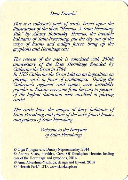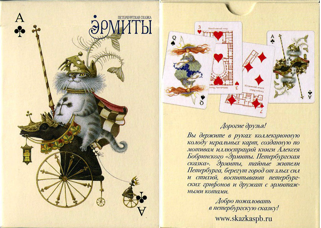 Above: “Hermits: Petersburg Tale” playing cards published to commemorate the 250th anniversary of the State Hermitage Museum founded by Catherine II in 1764. Manufactured by Nage Cards, St. Petersburg, 2014.