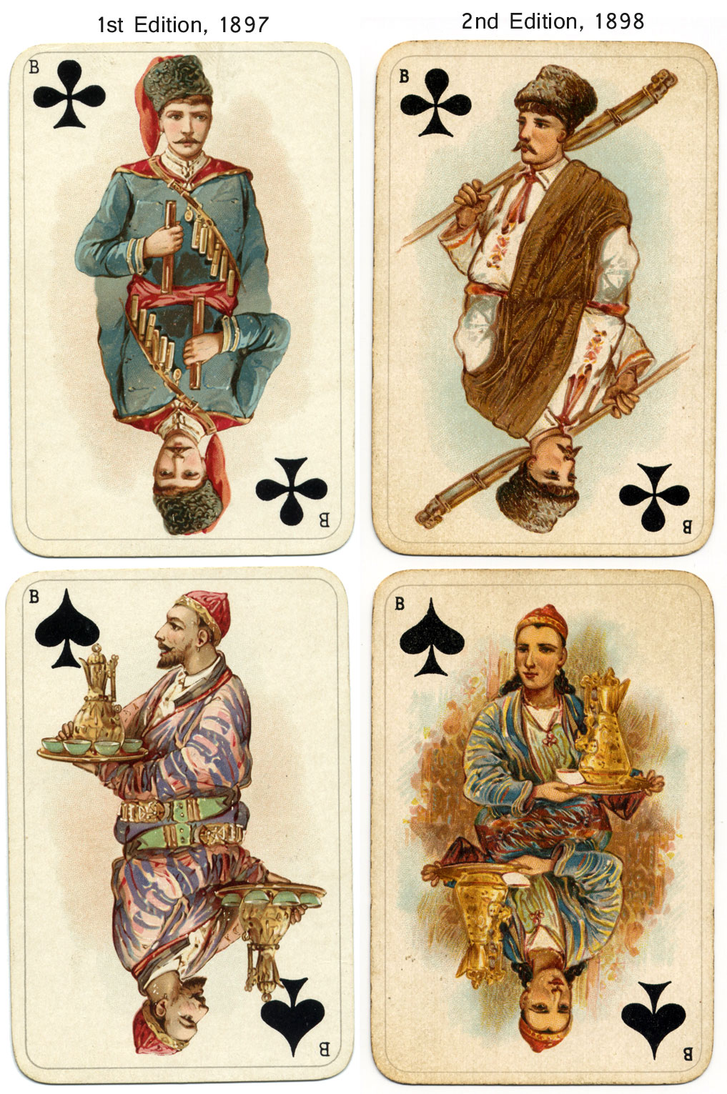 Russian “Historical” playing cards with designs by Nikolay Karazin depicting national imagery on the courts and aces. This is the first edition of 1897, in which the Jack of Clubs is a soldier. In the second edition (1898) the Jack of Clubs is a peaceful farmer see comparison here→