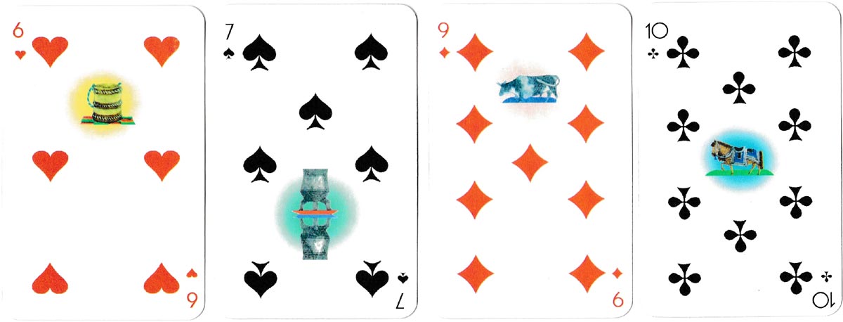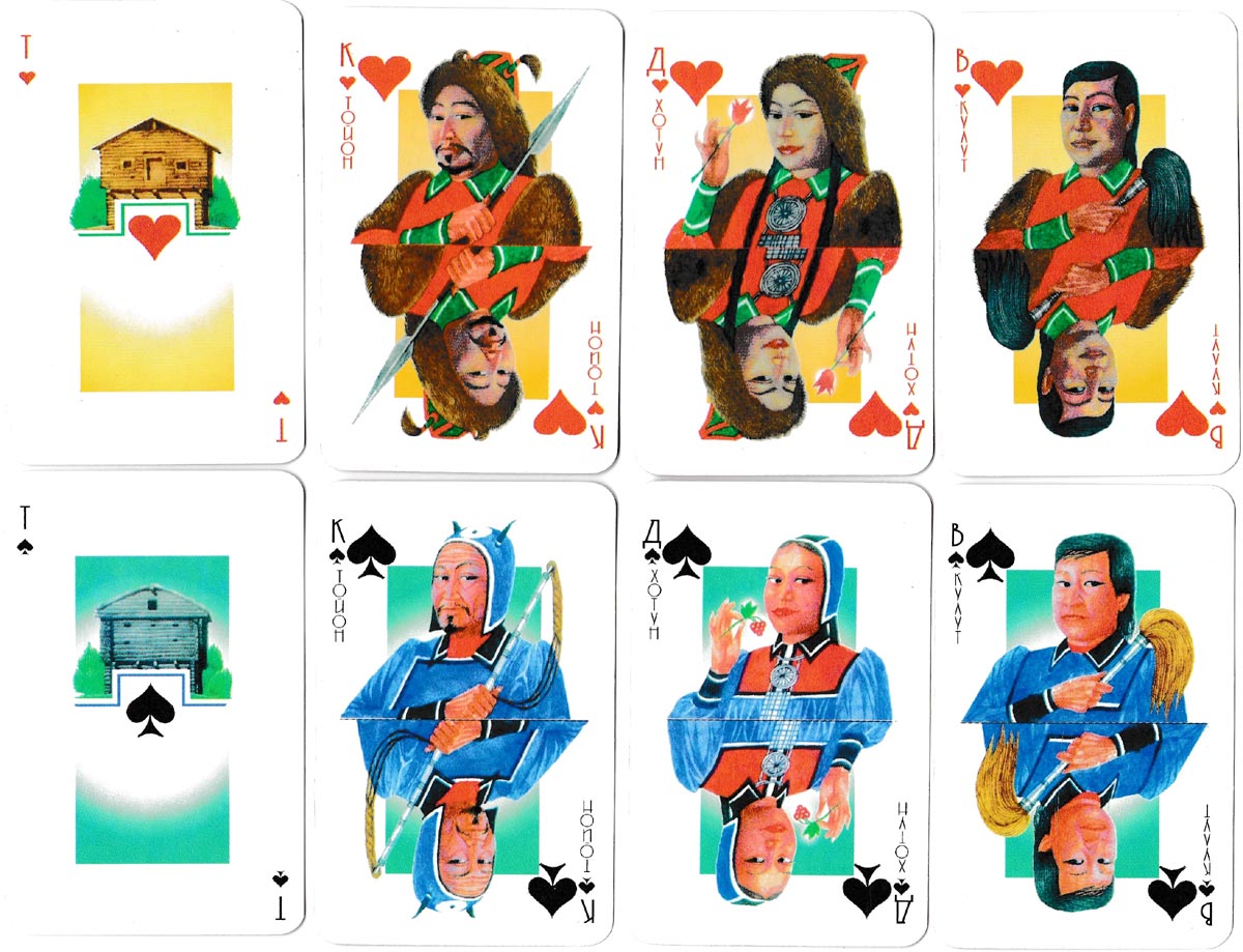 The Toyon kings in the deck correspond to the heads of the clan, the ladies - to the mistresses, keepers of the family hearth, and Kuluts to the master's servants. The aces depict the towers of the wooden fortress of ancient Yakutsk. The cards of each suit are executed in a different colour scheme: Hearts are shown against a yellow background; Spades against a green background; Diamonds against a pink background and Clubs against a blue background. The pip cards are decorated with images of livestock and utensils: the tens of all four suits show horses; the nines and eights – cows; the sevens and sixes - multi-coloured bowls and cauldrons.