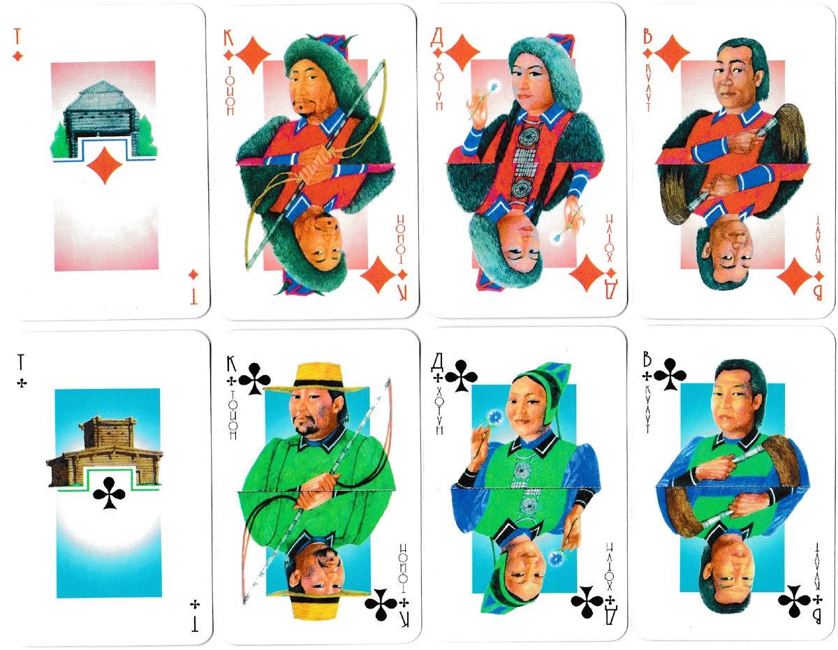 Hotel Lena playing cards were intended as a souvenir for guests at a hotel of the same name in the city of Yakutsk, the capital city of the Sakha Republic, Russia, located about 280 miles south of the Arctic Circle. The pack was published by Bichik in Yakutsk in 2001 and consists of 36 cards (no Jokers). The court cards depict men and women in national costumes. In addition to the usual Russian indexes of K, D and V, the author includes their denomination in Yakut: “Toyon” (“lord”), "Khotun" ("lady") and "Kulut" ("slave"). The “Toyon” king can be distinguished from the "Kulut" jack only by the fact that the Toyun wears a hat.