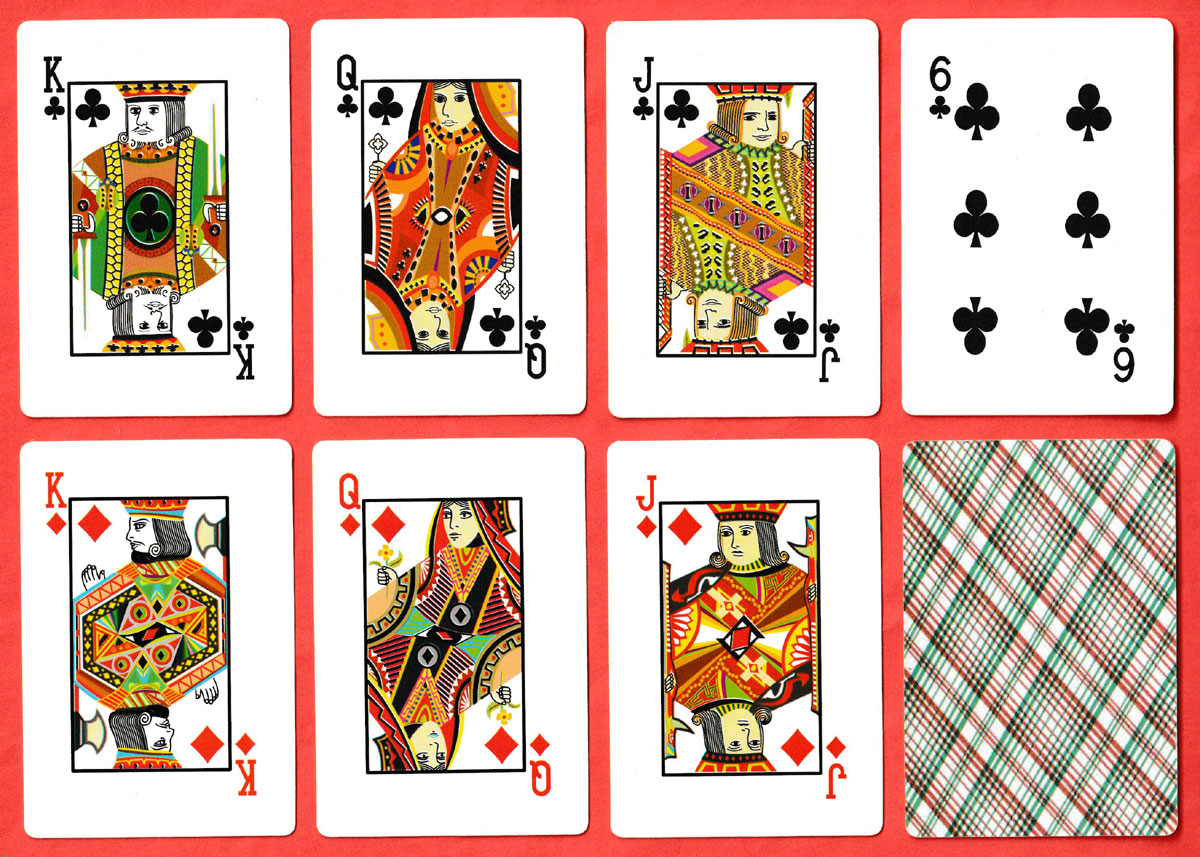 Sometimes a cheap pack bought in a foreign supermarket holds a surprise or two. In this case, a pack purchased in Riga turned out to be from Russia. The medium-size cards are amazingly colourful, almost as if the courts were wearing folk costumes. That said, the pattern is recognisably of the international (or English) type but with one or two quirky features: for instance, is that a candle or a smoking chimney on the Queen of Spades?! There is a red and green check pattern on the reverse • see the box