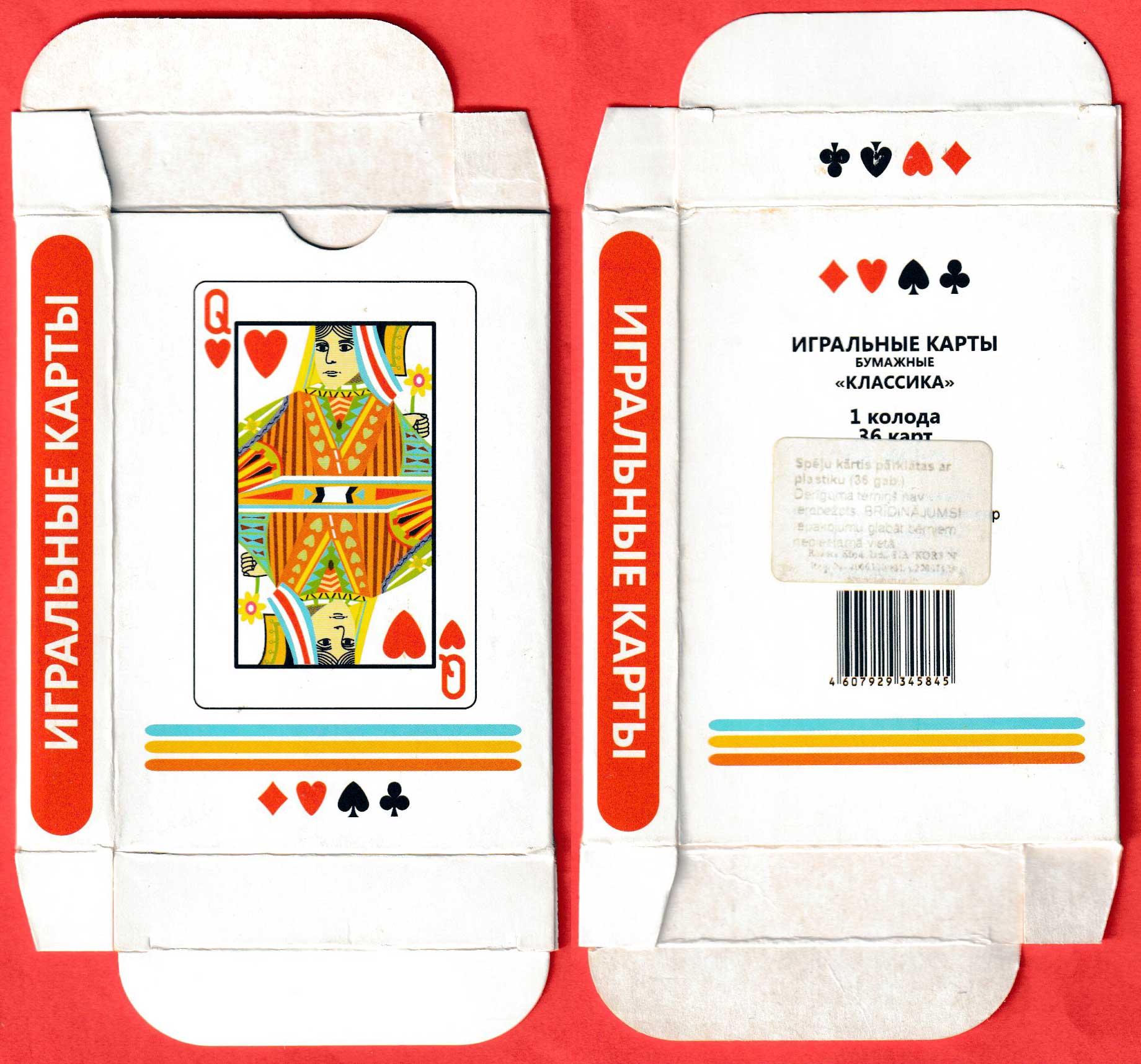 Above: International pattern from Russia, maker unknown (“Classica” brand). 36 cards in tuck box. Size: 55 x 80 mm. Purchased in Riga, Latvia, 2018. The faint label on the back of the box is in Latvian.