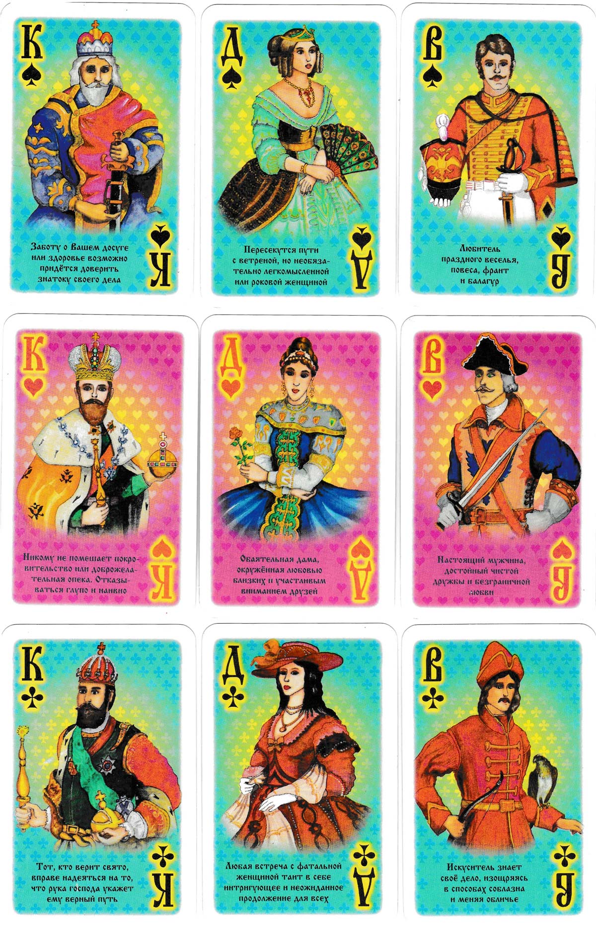 Karty Derzhavnye fortune-telling cards were published in 1997 by the Kombinat Tsvetnoi Pechati, St. Petersburg. It is sometimes also translated as “Imperial”. The full pack contains 56 cards (52 cards + 2 jokers + 2 double-sided information/description cards). The author of the deck is S. Spirov and the artist is S. Zaitsev. The creators of the deck have incorporated into the pack the popular fortune-telling system “Fate and Will” and the “Pyramid of Success” solitaire as its basis.