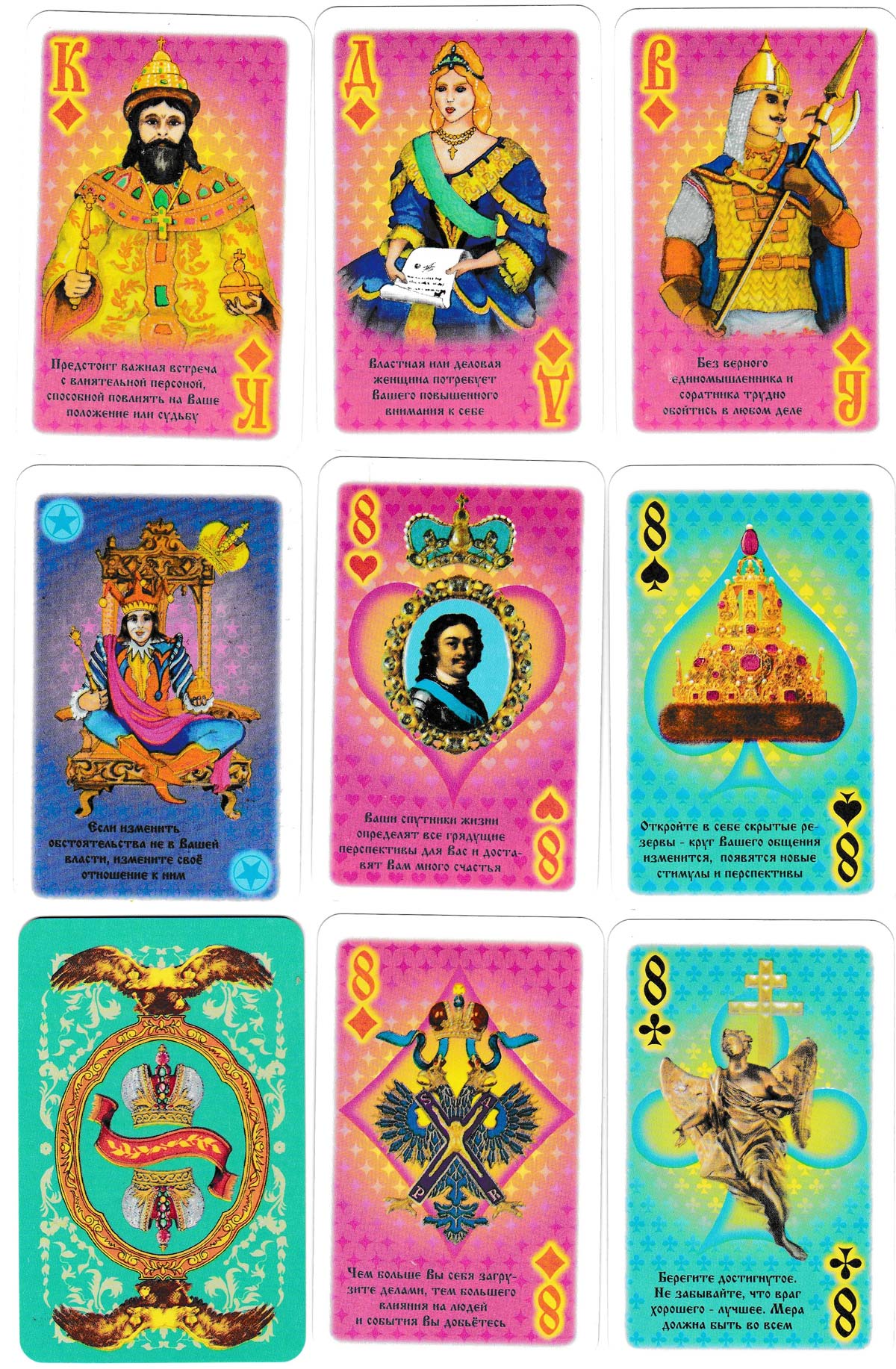 The clubs and spades have a blue/turquoise background while the hearts and diamonds have a red background. The court cards differ in each suit, but the pip cards in each suit only have one background symbol: hearts show Peter the Great in a heart-shaped frame; diamonds show the two-headed eagle in a diamond frame; clubs show a bronze angel, while spades display a royal crown in a spade-shaped frame. The two extra cards explain how to arrange and interpret the cards for fortune-telling.