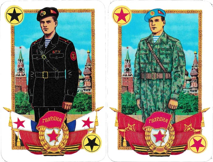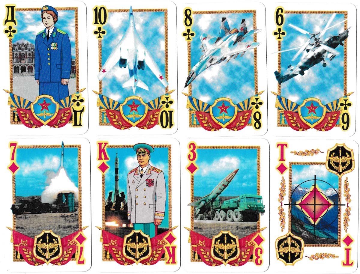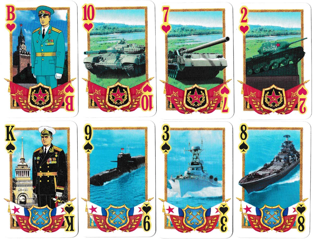 This military pack extols the bravery and patriotism of the Russian armed forces. The suits (both court and pip cards) portray officers and equipment from different areas of the Russian forces. Hearts show the tank service; Clubs similarly portray the air force; Spades the naval service and Diamonds the anti-aircraft or rocket / missile service.