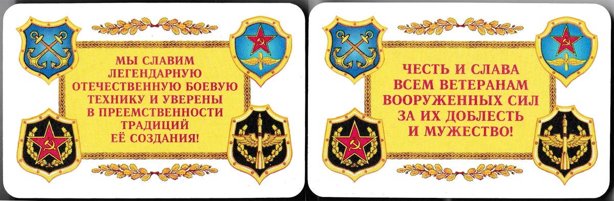 Although published in 1997, several years after the collapse of the Soviet Union, the card backs show the hammer and sickle, while this same symbol appears in two of the military emblems. The 2 extra cards proclaim: “Honour and praise to all the veterans of the armed forces for their valour and courage” and “We glorify the legendary patriotic military technology and are confident the tradition of its creation will continue”. Produced in St. Petersburg by the Colour Printing Plant, the authors of the pack are; S. Spirov, I. Ovchinnikov and V. Volkov. The artist is S. Zaitsev. See the box►