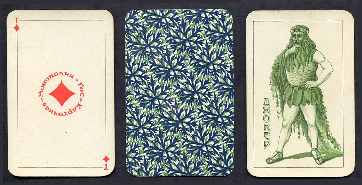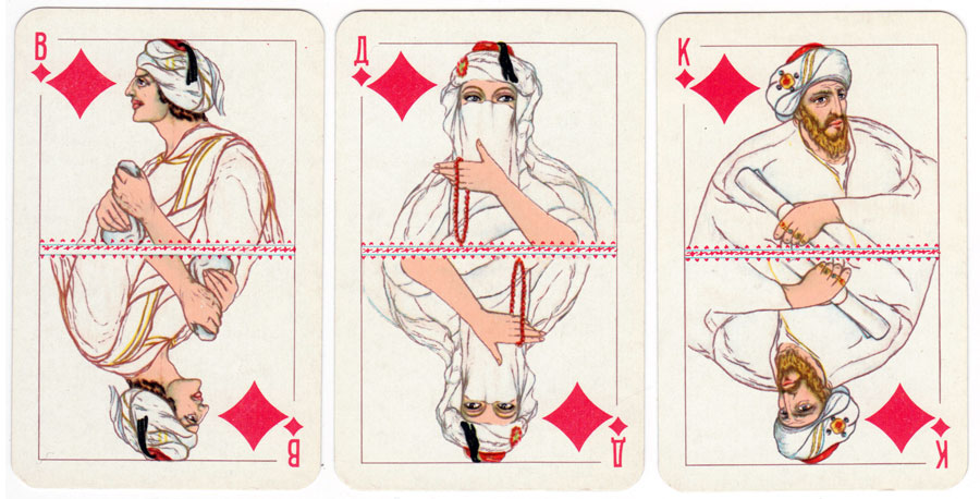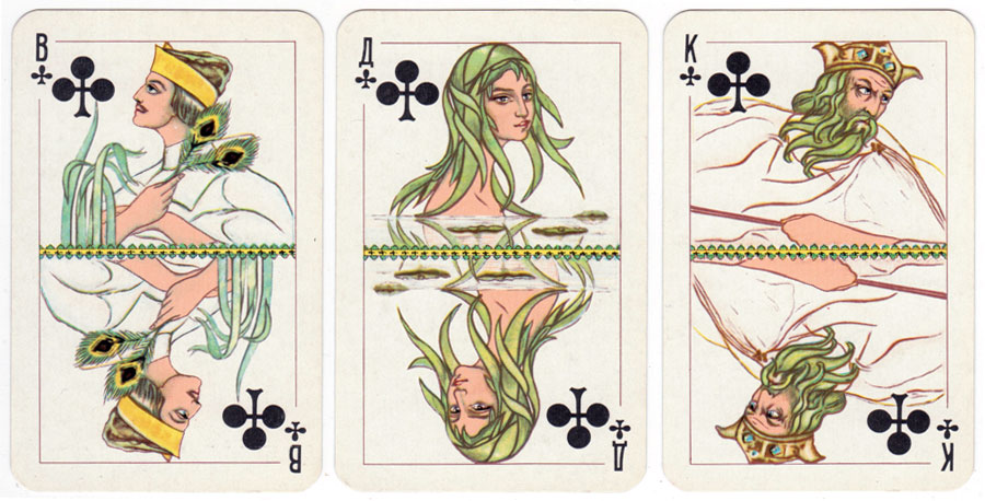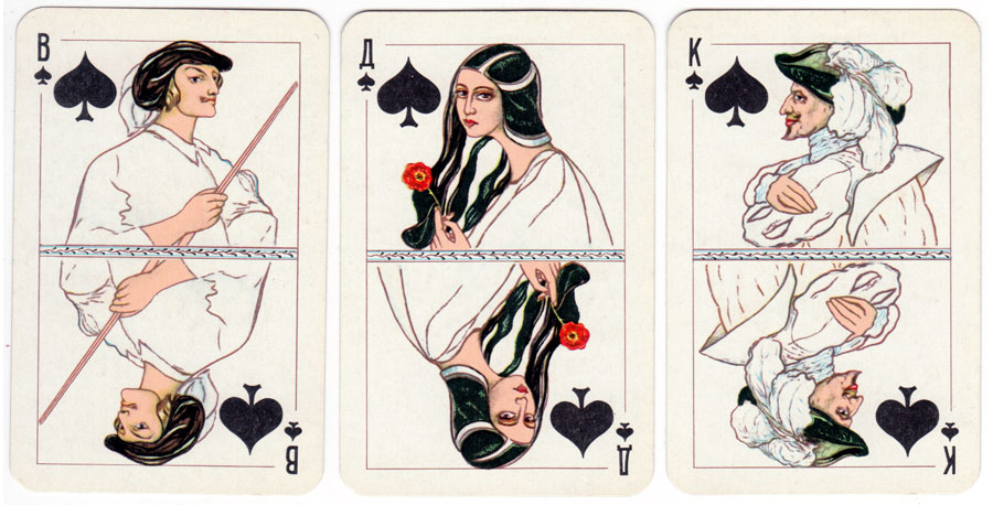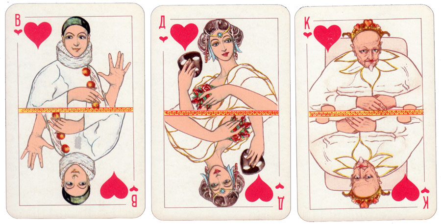 Playing cards showing the influence of ‘Jugendstil’ first manufactured by the Soviet Playing Card Monopoly (U.S.S.R.) in 1911 and then again in c.1930. The well-designed court figures are colour coordinated, and represent characters taken from literary works, pantomimes and comedy (Queen of Diamonds as Scheherazade, Queen of Clubs as a mermaid, Knave of Hearts as Pierrot). Some editions are known with English indices suggesting that the cards were also intended for export.