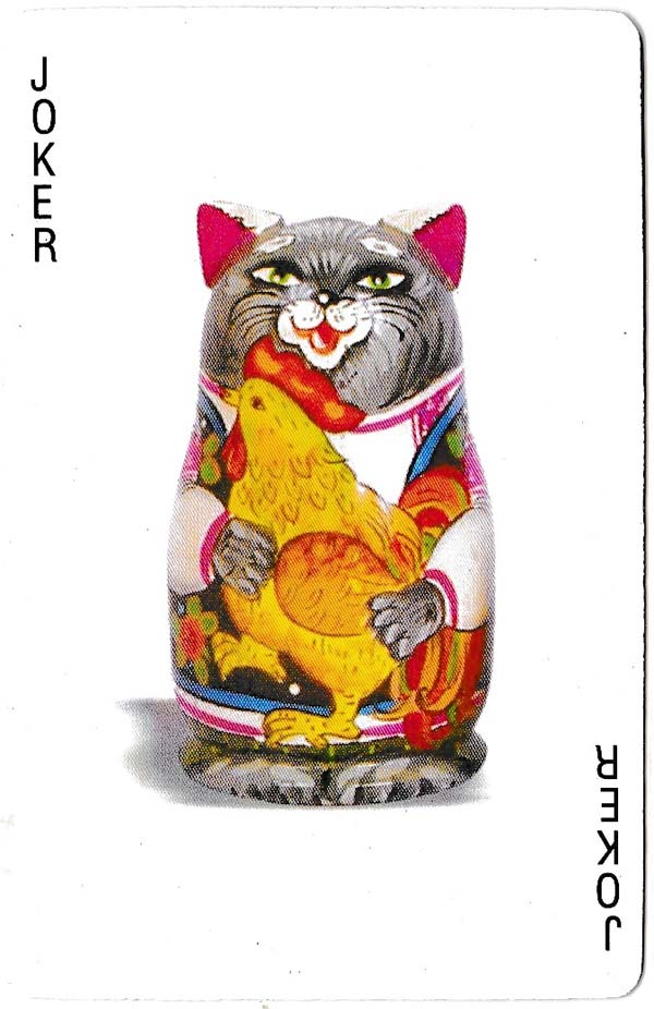 A pack of 52 cards and 2 Jokers, each card depicting a different matryoshka (nested doll). The pack contains an extra card describing the history of the Russian matryoshka. The first nested doll set was carved in 1890 by Vasilii Gvezdochkin (1876 - 1956) from a design by Sergei Maliutin (1859 – 1937) who was a folk crafts painter on the estate of the Russian industrialist and patron of the arts Savva Mamontov. In 1900 Mamontov’s wife presented the dolls at the World Exhibition in Paris and the toy earned a bronze medal. Soon after, matryoshka dolls were being made in several places in Russia. Today they not only portray traditional folk costume, but also animals, and political, comic and imaginary figures.